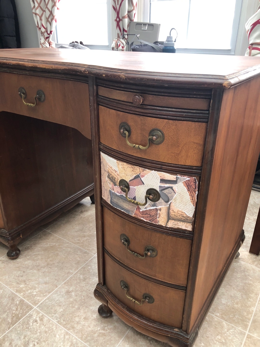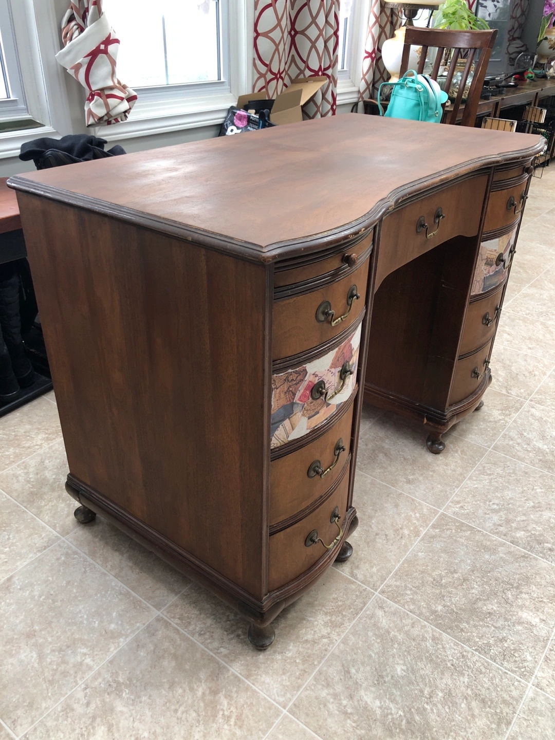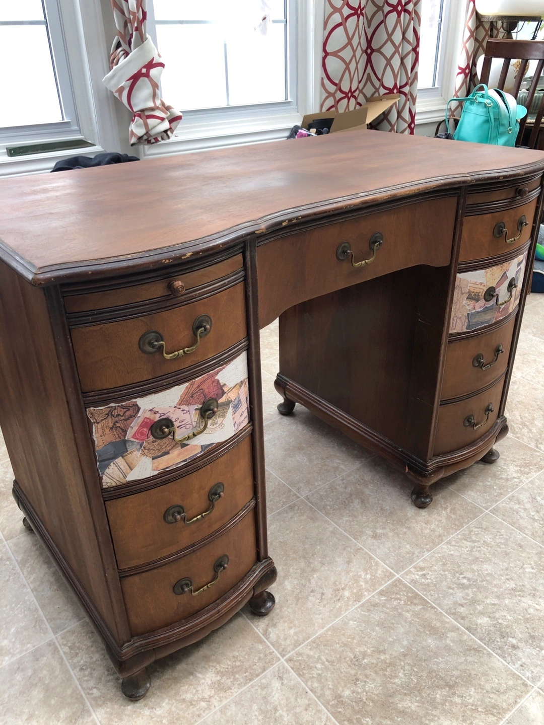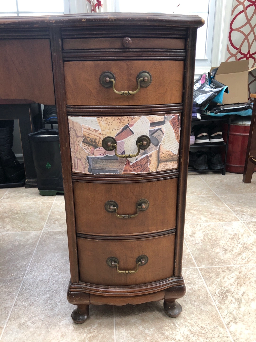 Two pull out, removable trays at the top which adds to the usable writing surface. 8 drawers. The bottom two on the right (looking at it) is actually one, nice, deep drawer for your big items.