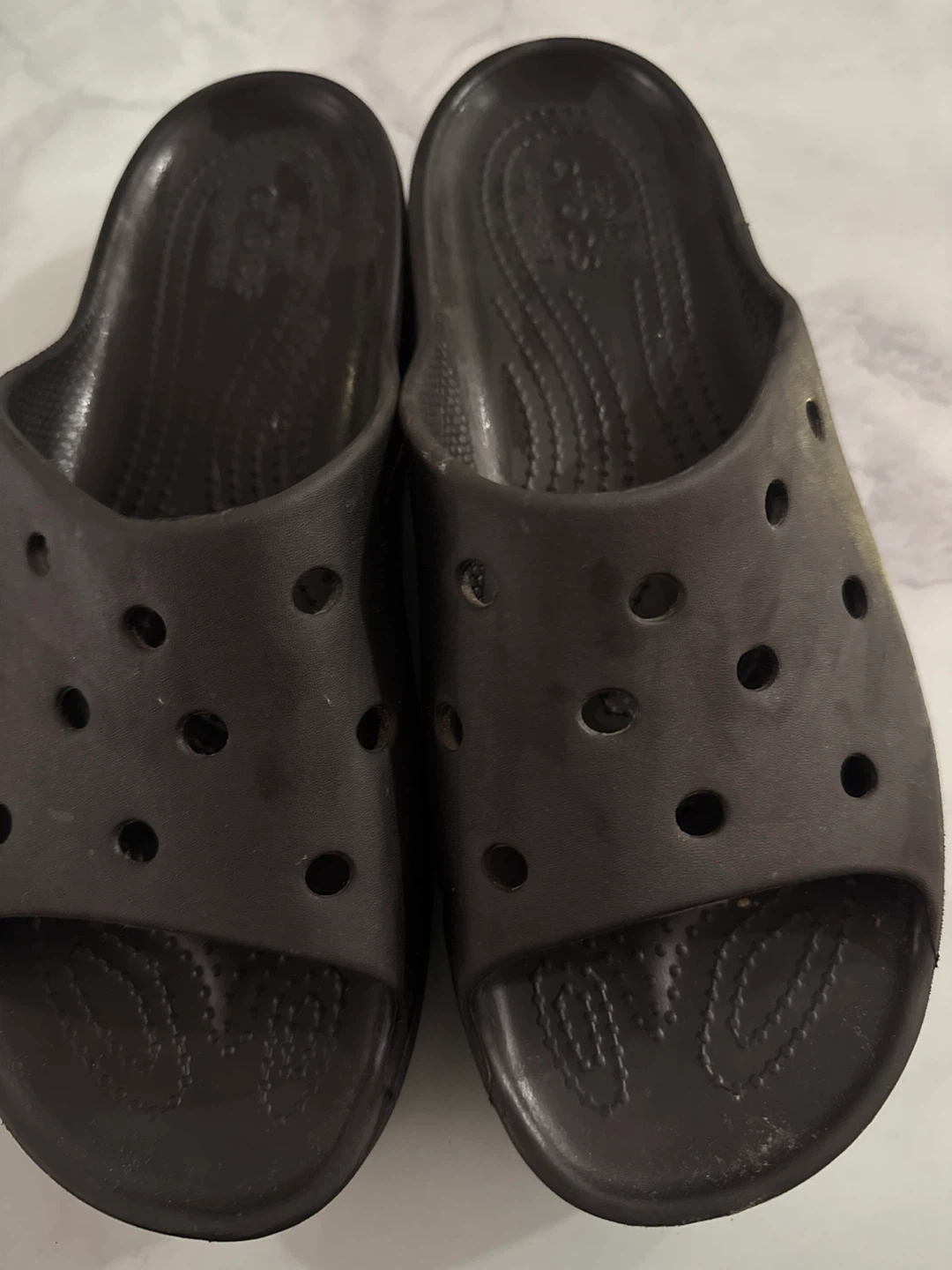 Selling a pair of black Crocs slides in women's size 9! They're in good condition and ready for a new owner