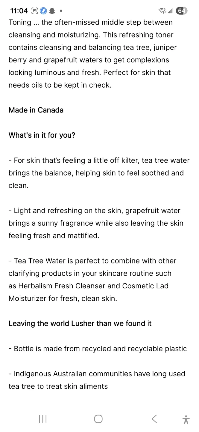 This refreshing toner contains cleansing and balancing tea tree, juniper berry and grapefruit waters. Made in Canada. Bottle is made from recycled and recyclable plastic.