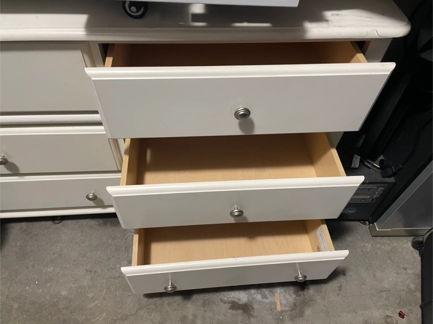 Here's a sturdy 6-drawer dresser in a clean white colour. It's perfect for adding extra storage to any bedroom or living space. The drawers slide smoothly, making it easy to access your belongings. It's in great condition and ready for a new home! This dresser is 52 inches wide and a little more then 27 inches long
