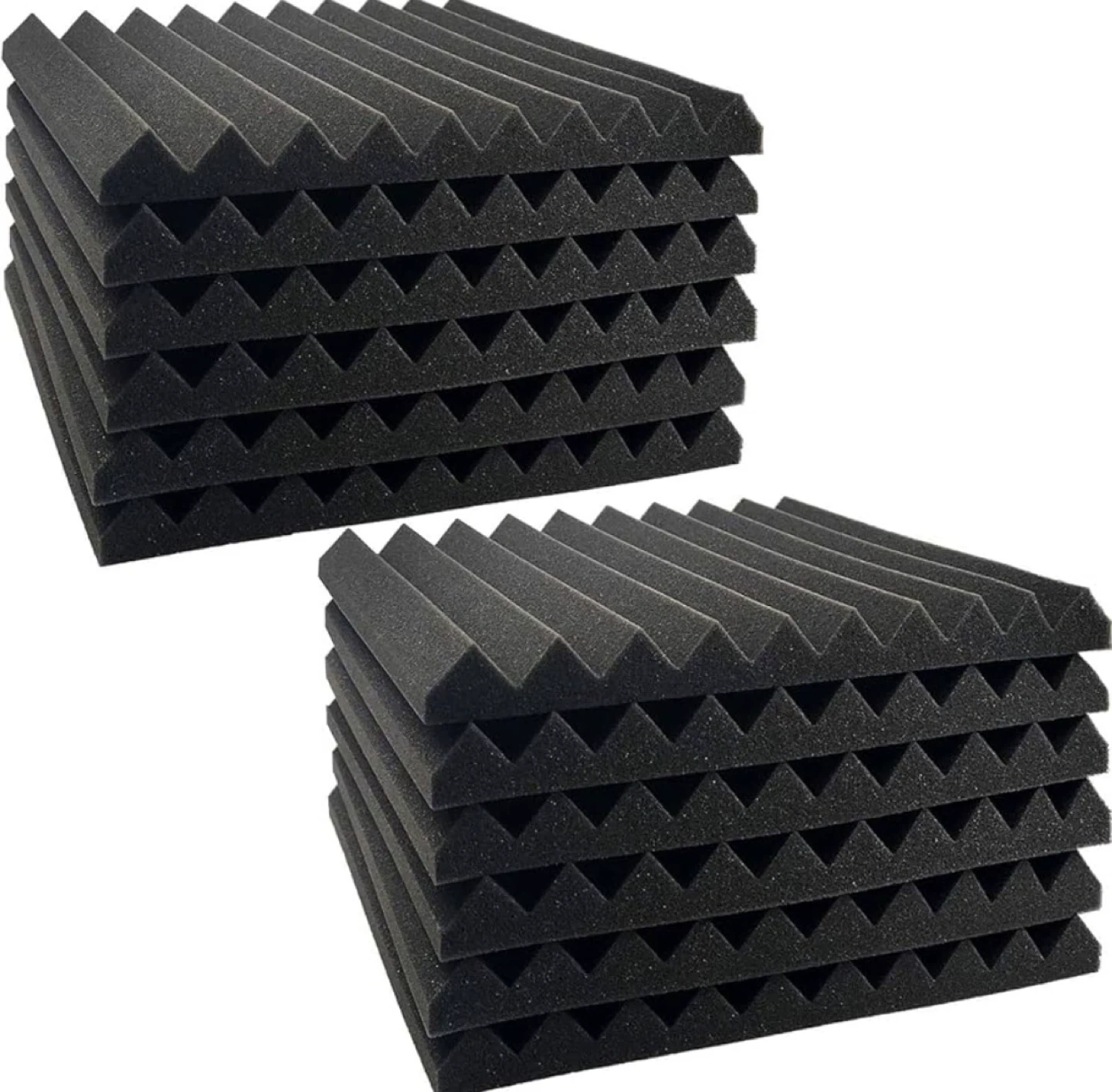 Set of black acoustic foam panels. Each panel measures 12 x 12 inches with a 1-inch thickness. Includes adhesive dots for mounting.