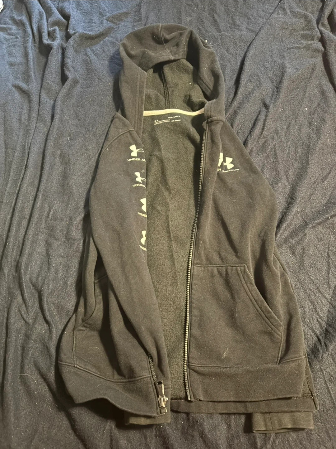 Selling a black Under Armour full zip hoodie. It's in good condition and perfect for layering on those cooler days. The hoodie features the Under Armour logo on the sleeve and chest. It's a comfortable and stylish addition to any wardrobe!