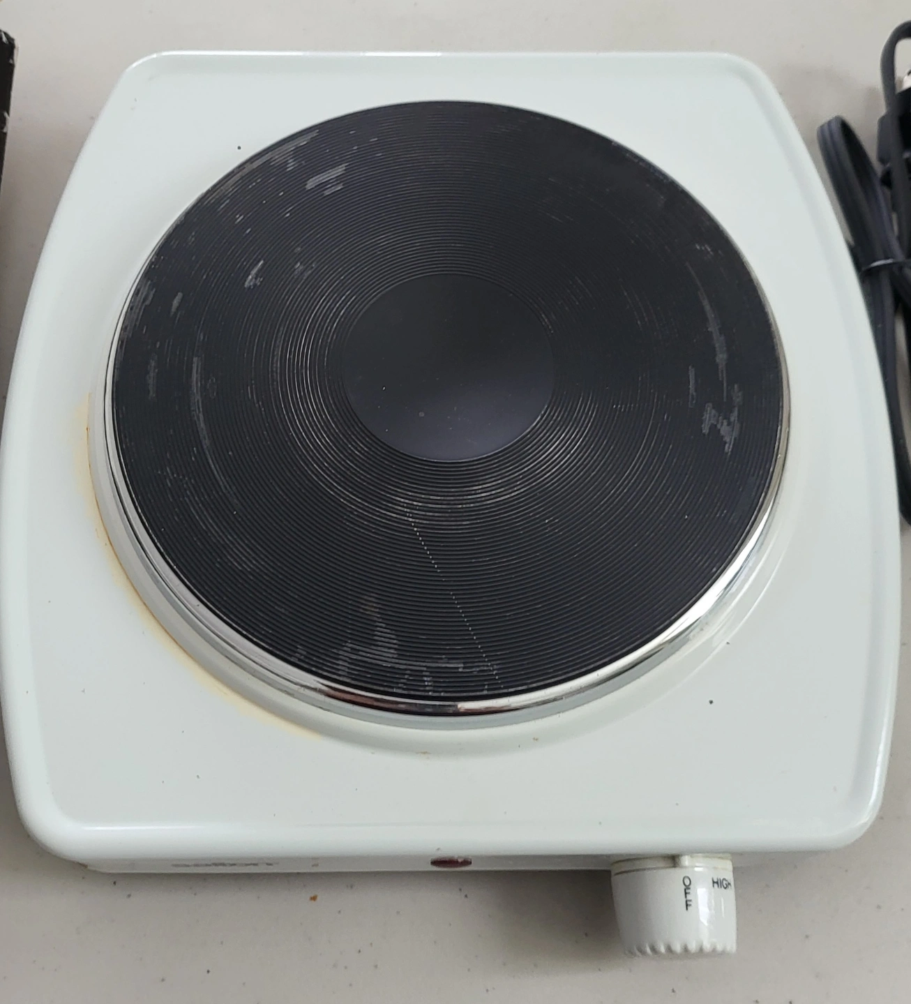 Vintage Salton portable cooking range. Model HP-10. Solid element for efficient heat transfer. Easy to clean. Features temperature control knob and indicator light. Perfect for dorms, cottages, offices, camping.