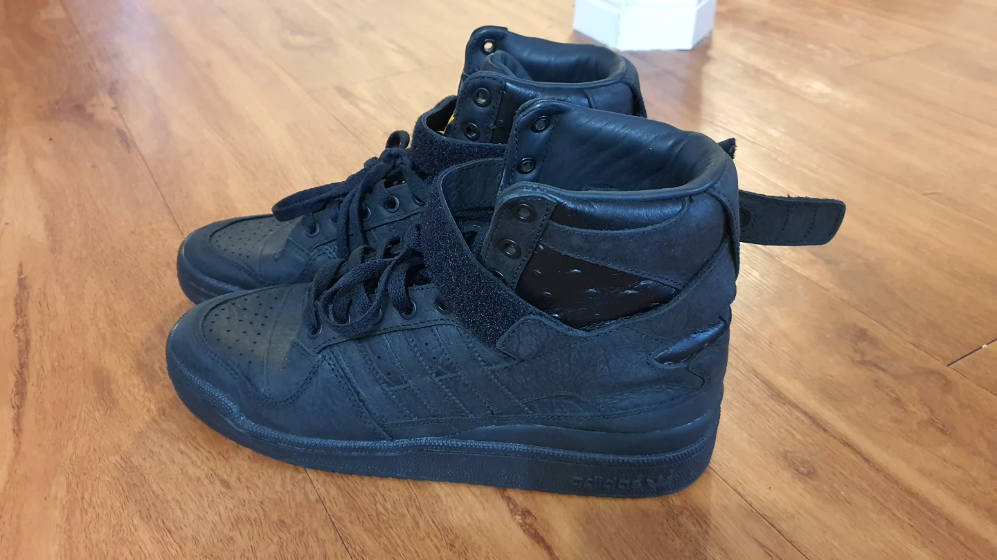 Black Adidas Forum high top sneakers. Lace-up closure with adjustable ankle strap. Leather material.