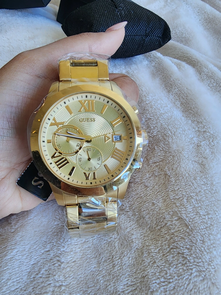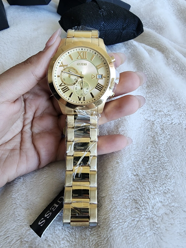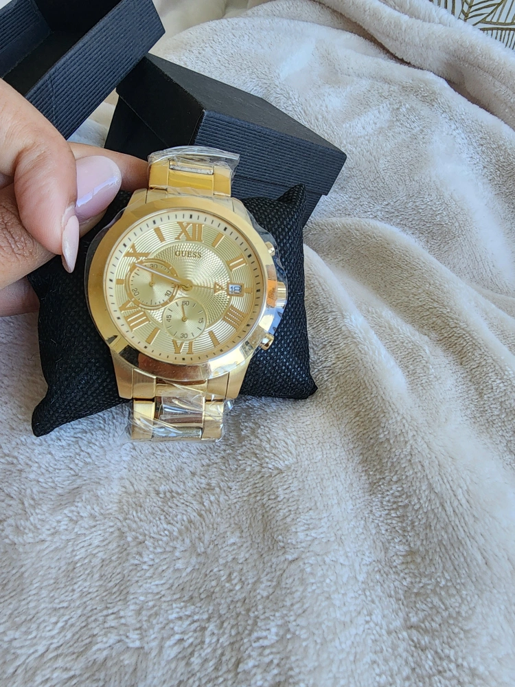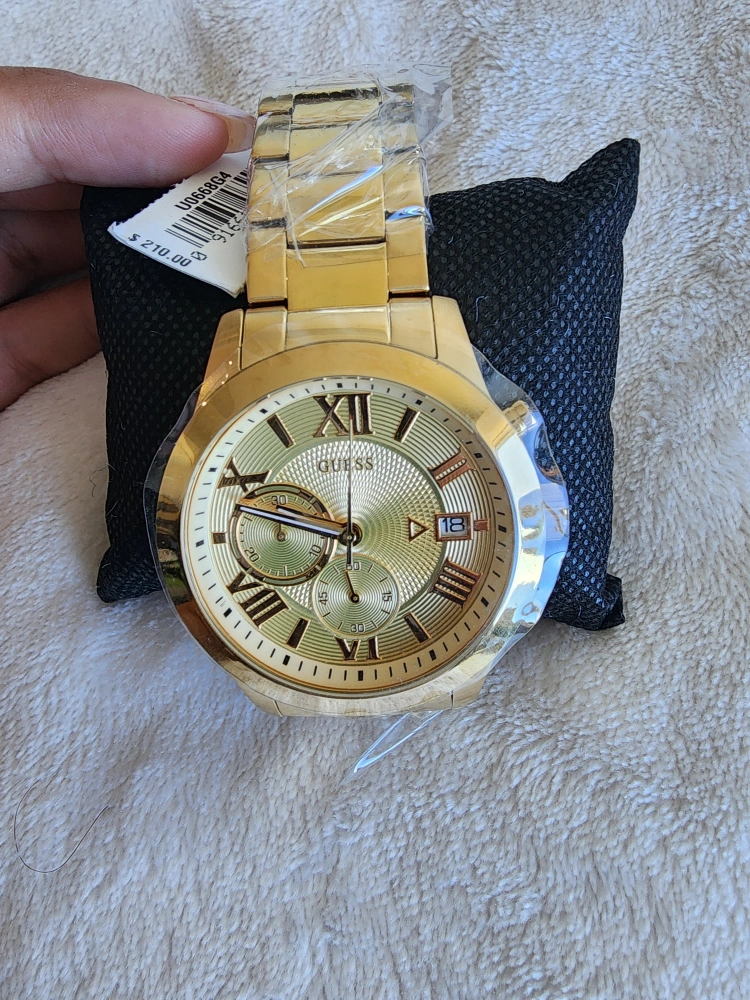Selling a brand new Guess men's watch in gold. It still has the original packaging and tag attached. The original price was $210. Comes with the box!