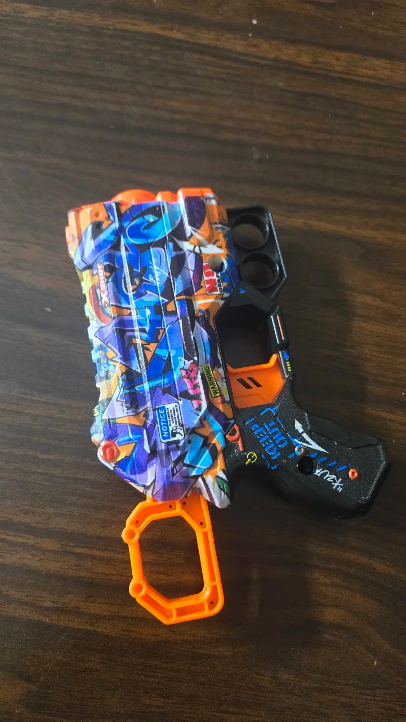 This X-Shot blaster toy gun has a vibrant graffiti-style design. It features an orange trigger and grip accents. The blaster is made of plastic and includes a notice label on the side.