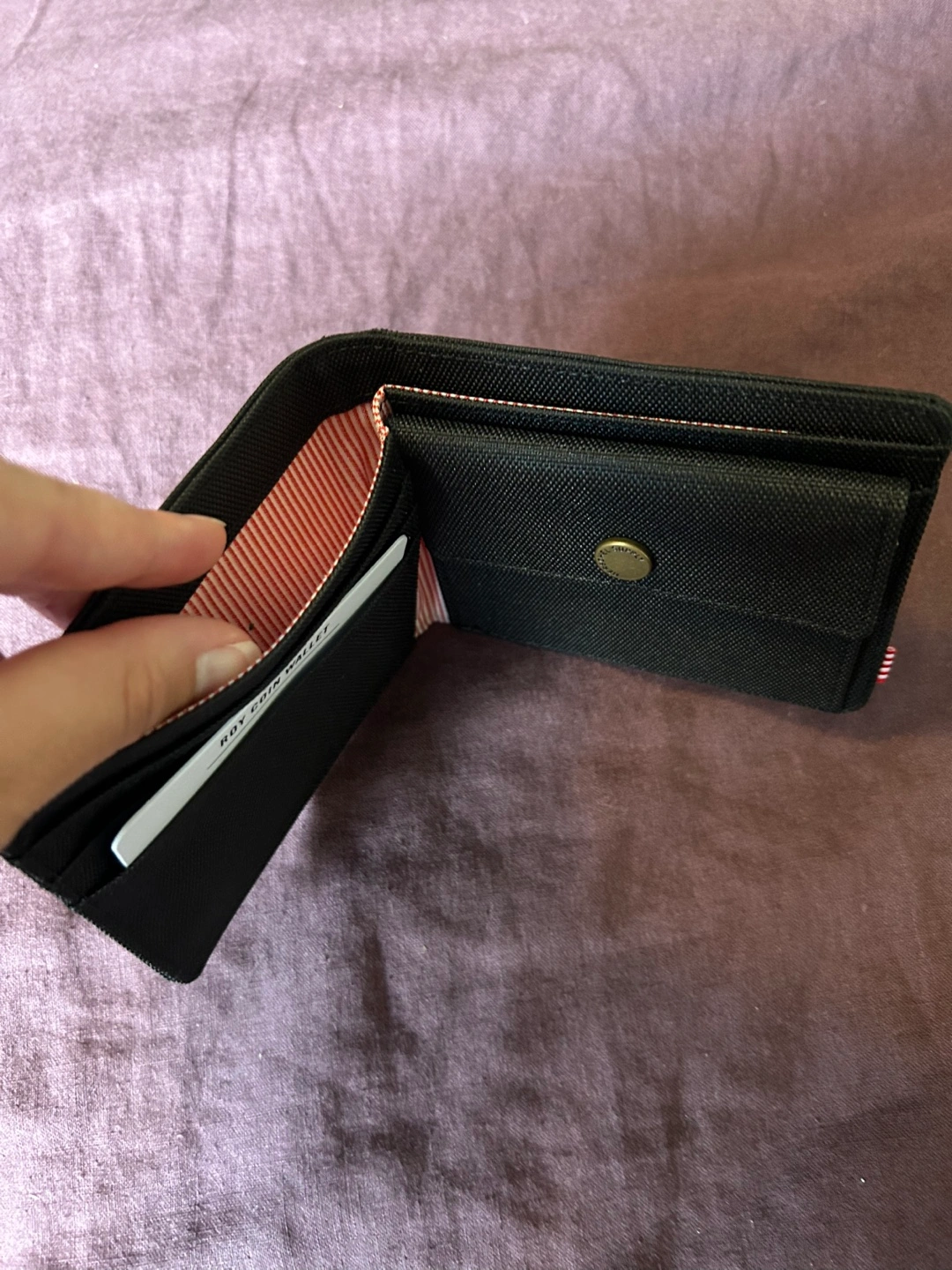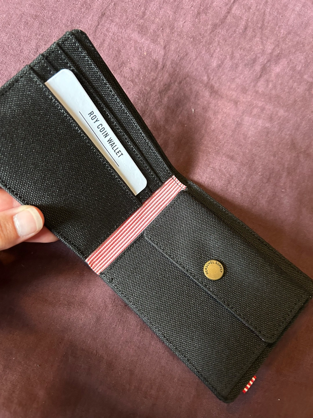 Black Herschel Roy Coin Wallet. Features multiple card slots and a coin pouch. Durable, lightweight material. Never used, tags on.