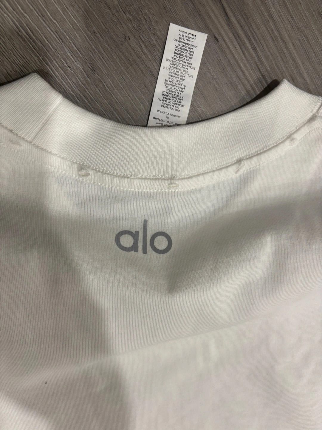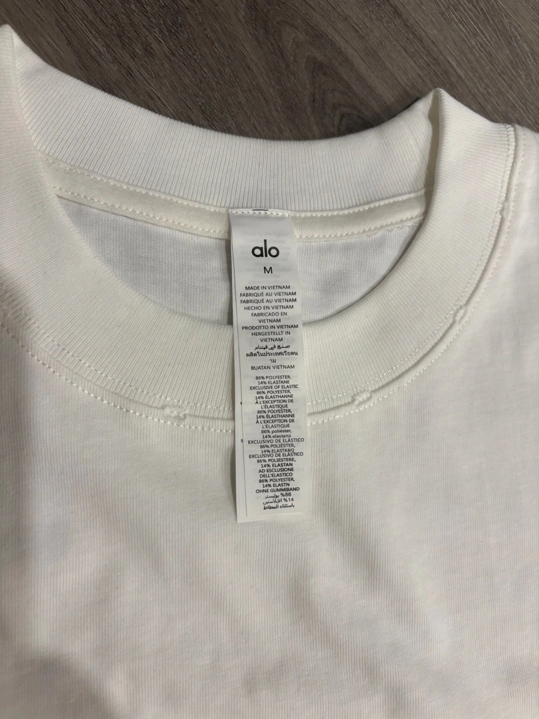This is a brand new Alo Yoga t-shirt in a lovely cream colour! It's a size medium and is still in the original packaging. The material is 86% cotton and 14% elastane, so it's nice and stretchy and comfy