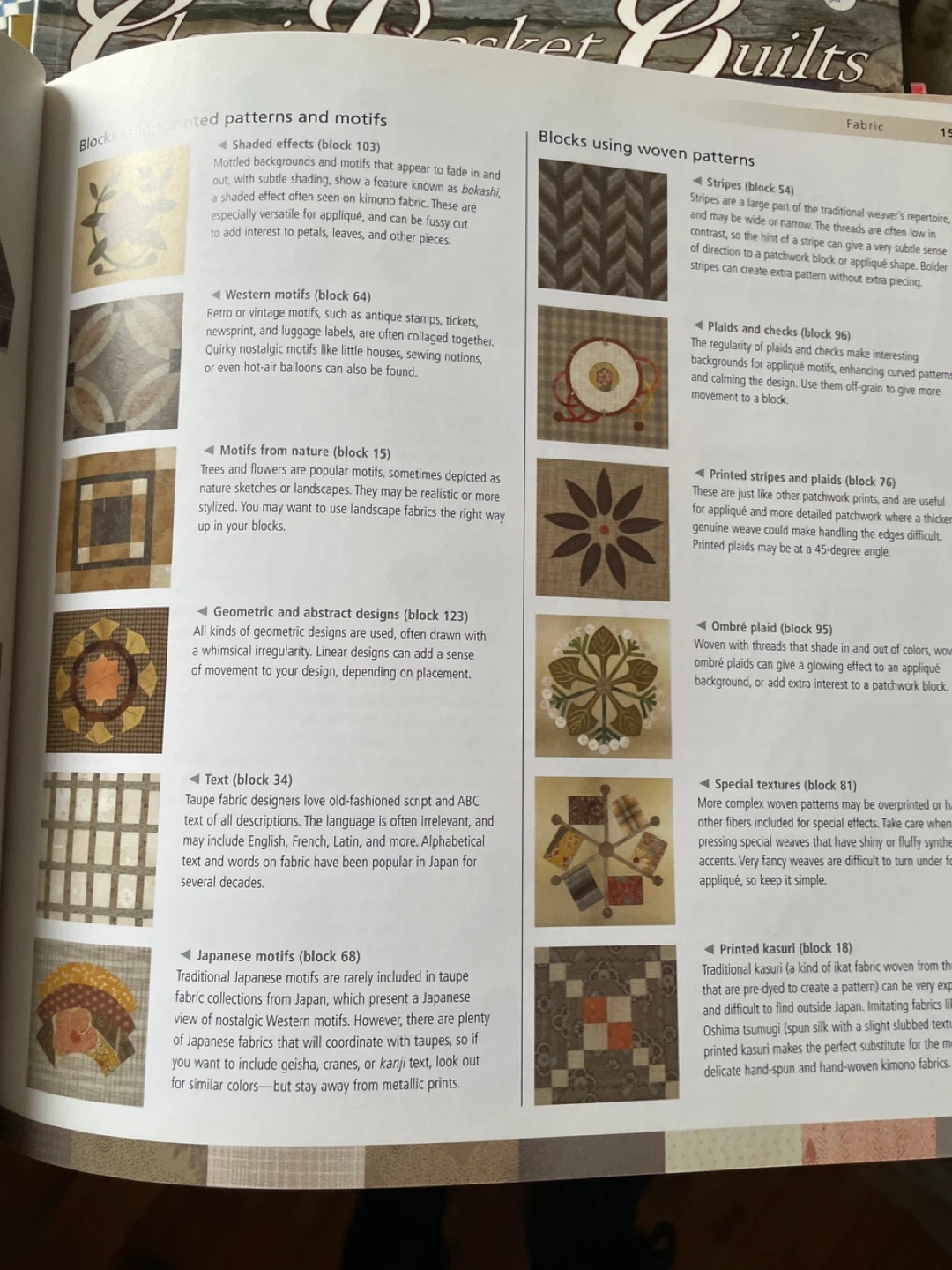 This book features 125 Japanese taupe quilt blocks in calm and neutral colours. It includes traditional Japanese quilt patterns, fabric, paper, and architectural designs. Step-by-step photos explain techniques for applique, embellishment, and quilting. Six simple projects are included.