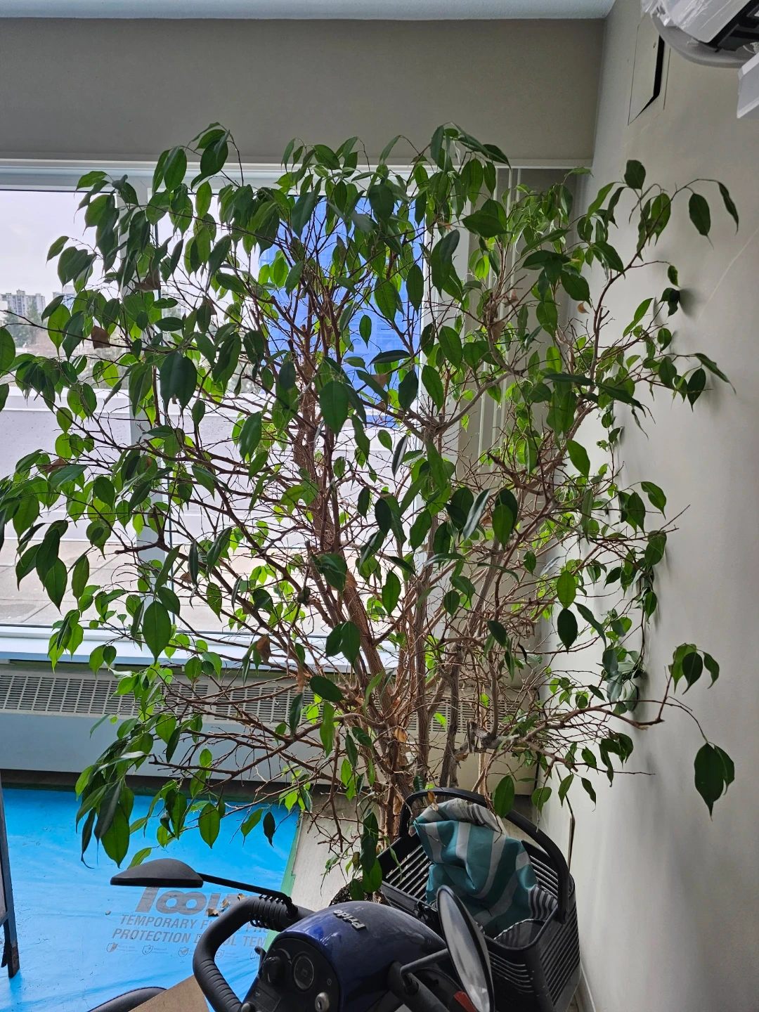 This is a large Ficus tree in a white pot. It's a great statement piece for any home or office space. Its lush green leaves add a touch of nature indoors. It measures approximately 5 feet tall.