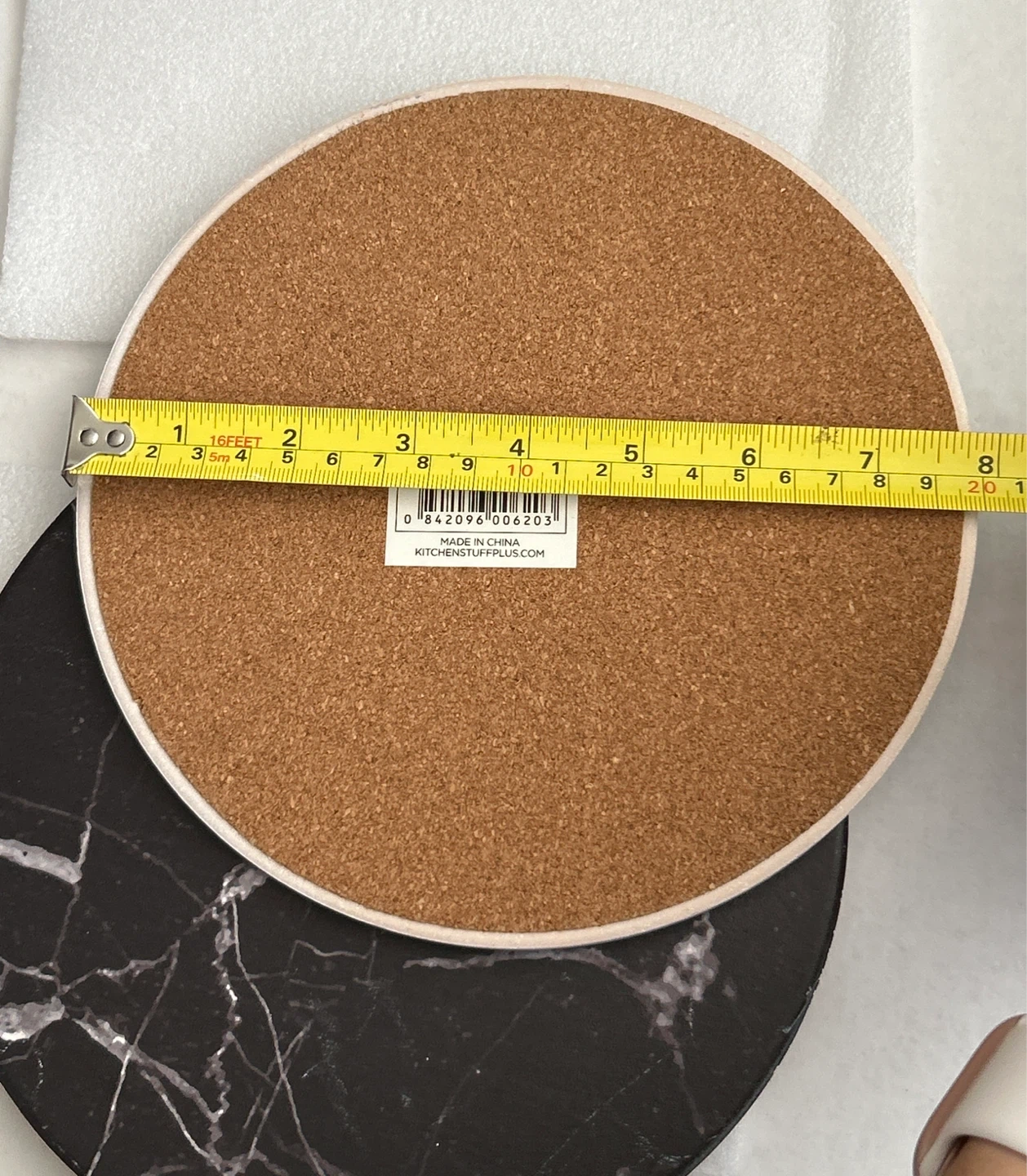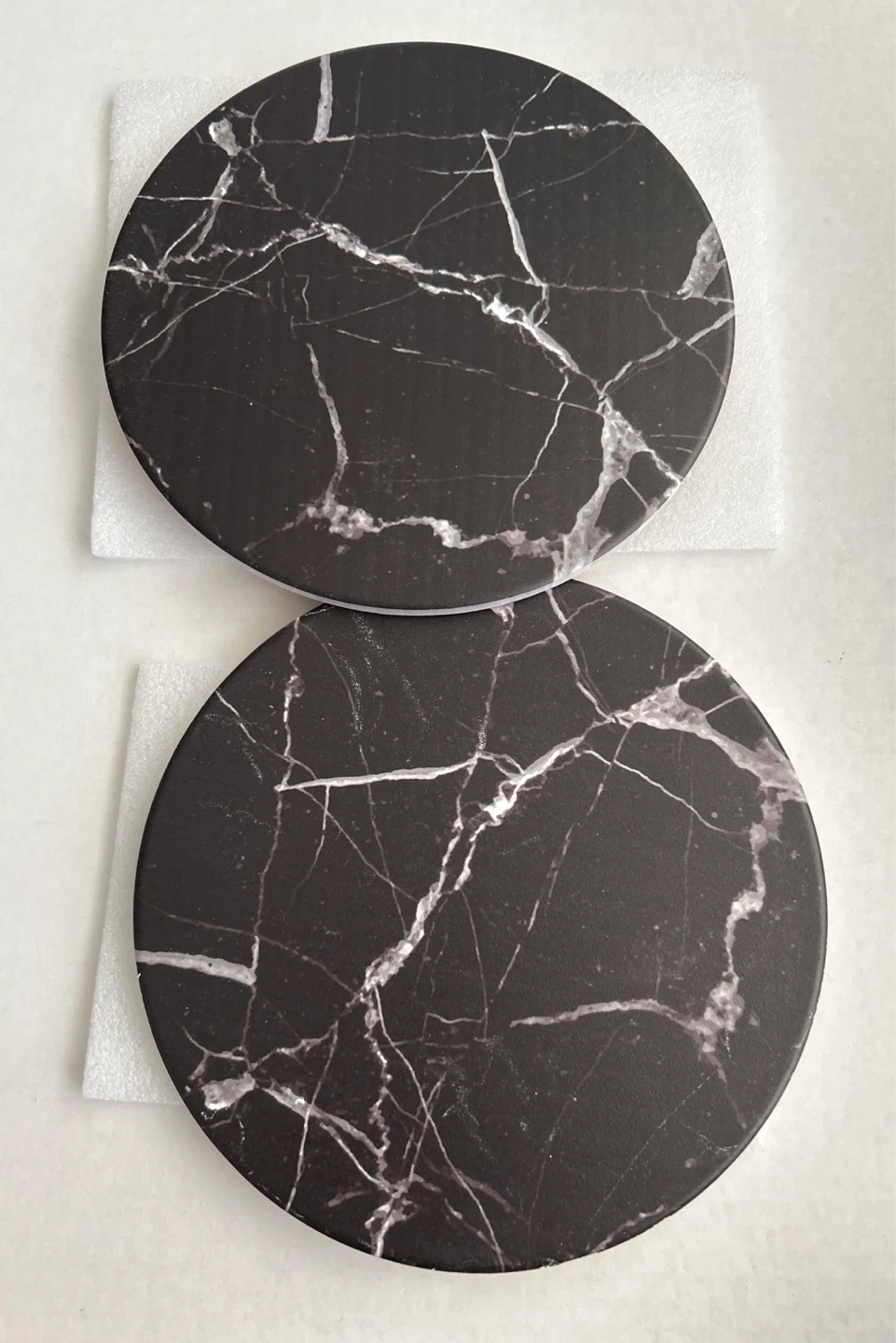 Selling a 2 ceramic trivets from Kitchen Stuff Plus! These are in a marble black colour. They measure approximately 8 inches in diameter and have a cork backing. Great for protecting your surfaces!