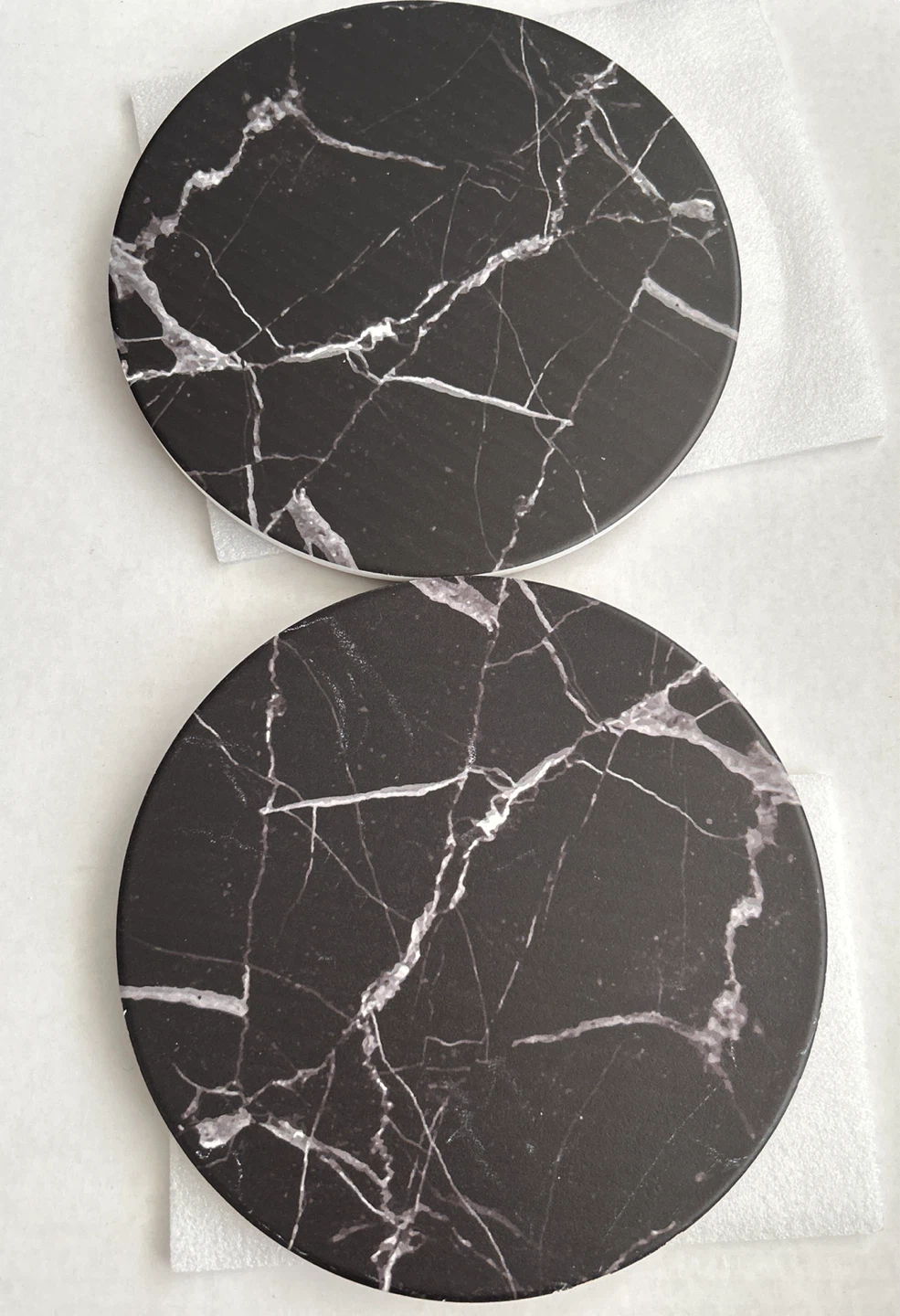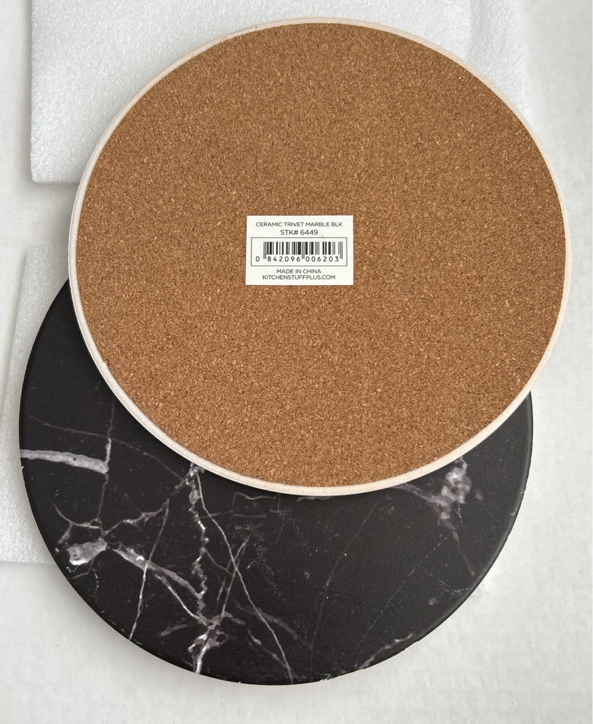 Selling a 2 ceramic trivets from Kitchen Stuff Plus! These are in a marble black colour. They measure approximately 8 inches in diameter and have a cork backing. Great for protecting your surfaces!