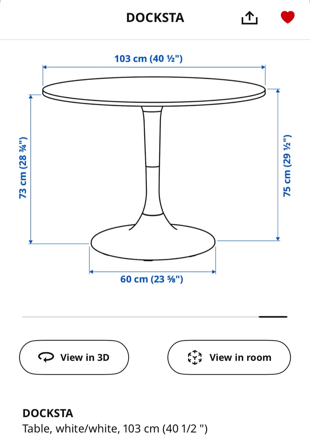 This is the DOCKSTA table from IKEA. It's white and measures 103 cm (40 1/2") in diameter. The table height is 75 cm (29 1/2"). This round table is great for a dining area or kitchen nook.