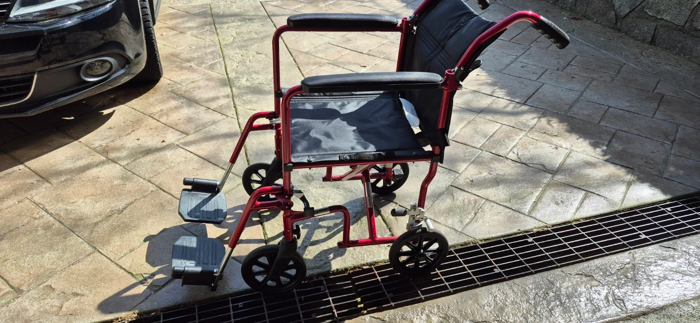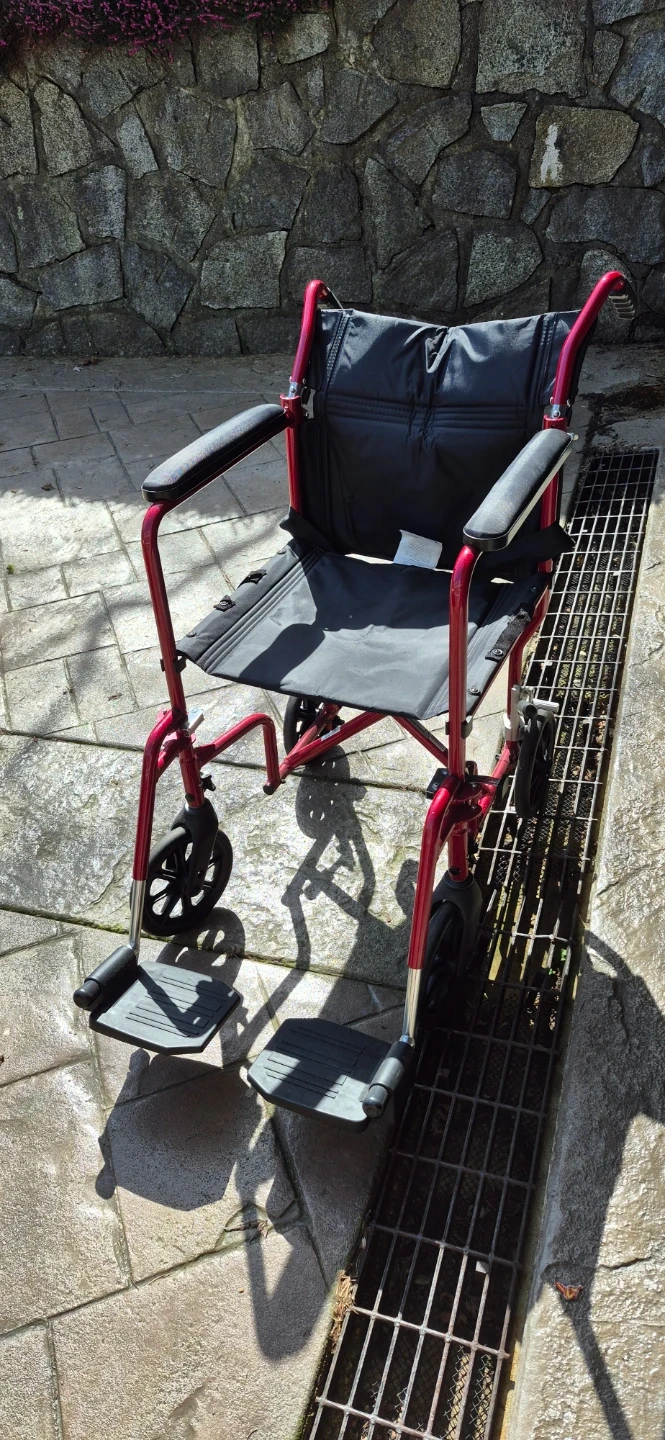 This red transport wheelchair is lightweight and easy to manoeuvre. It features padded armrests for comfort and flip-up footrests. It's designed for portability.