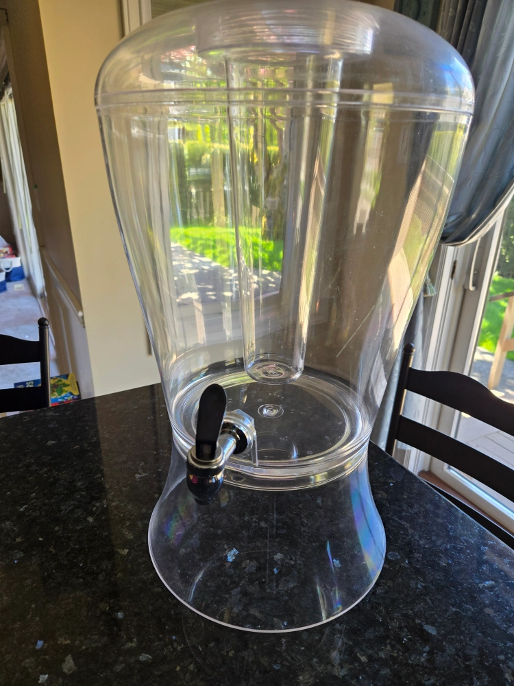 Large capacity beverage dispenser. Clear acrylic construction. Includes a stand, lid, ice cylinder and spout. Perfect for parties, backyard entertainment and serving drinks.