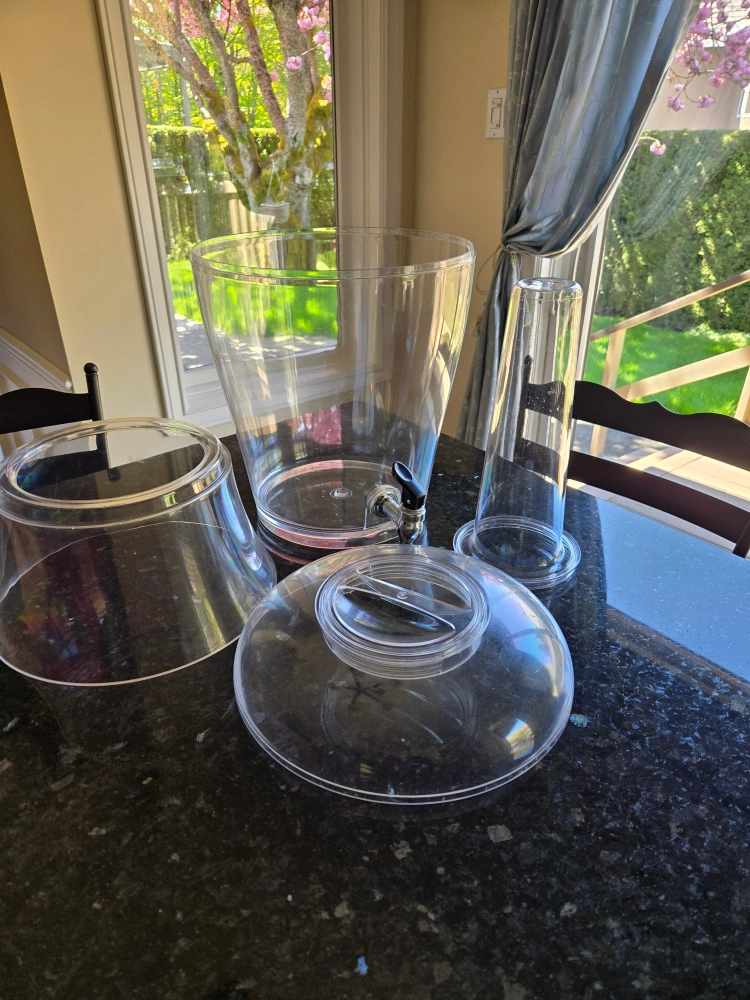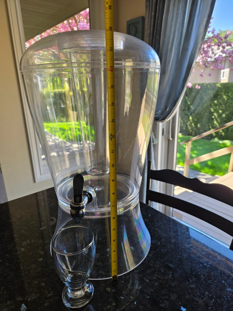 Large capacity beverage dispenser. Clear acrylic construction. Includes a stand, lid, ice cylinder and spout. Perfect for parties, backyard entertainment and serving drinks.