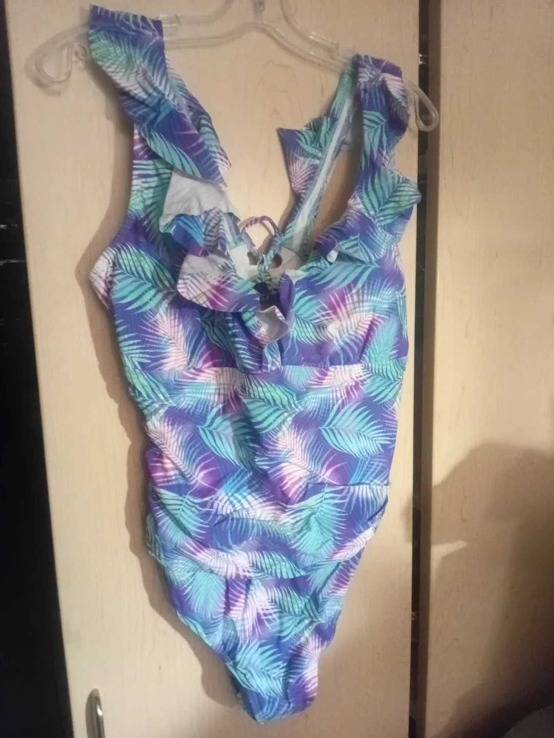 This one-piece swimsuit features a vibrant tropical leaf print with shades of purple, blue, and green. It has ruffled shoulder straps and a tie-back closure. Made from a blend of polyester and spandex for comfort and stretch.