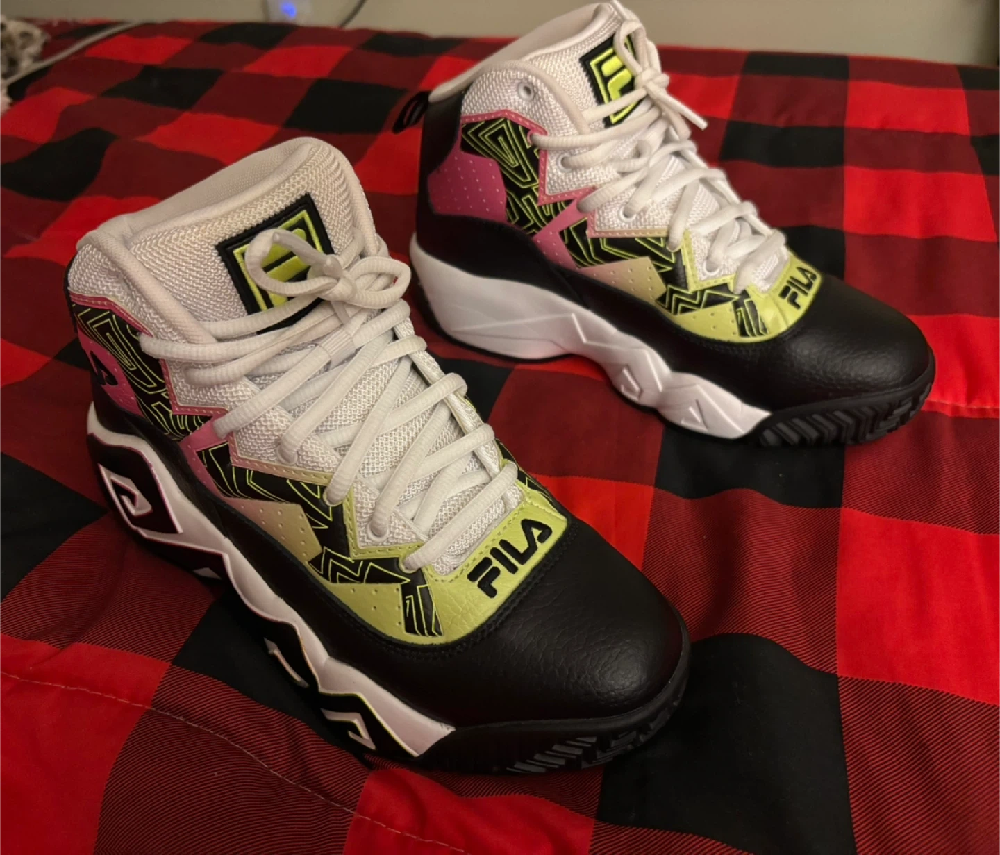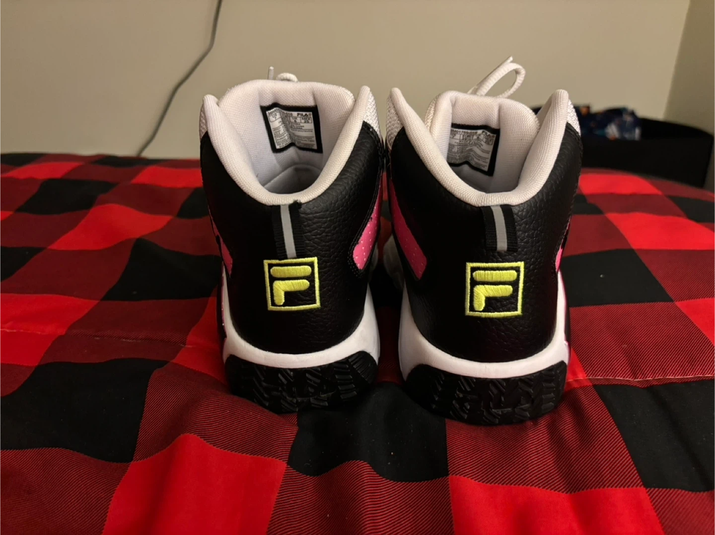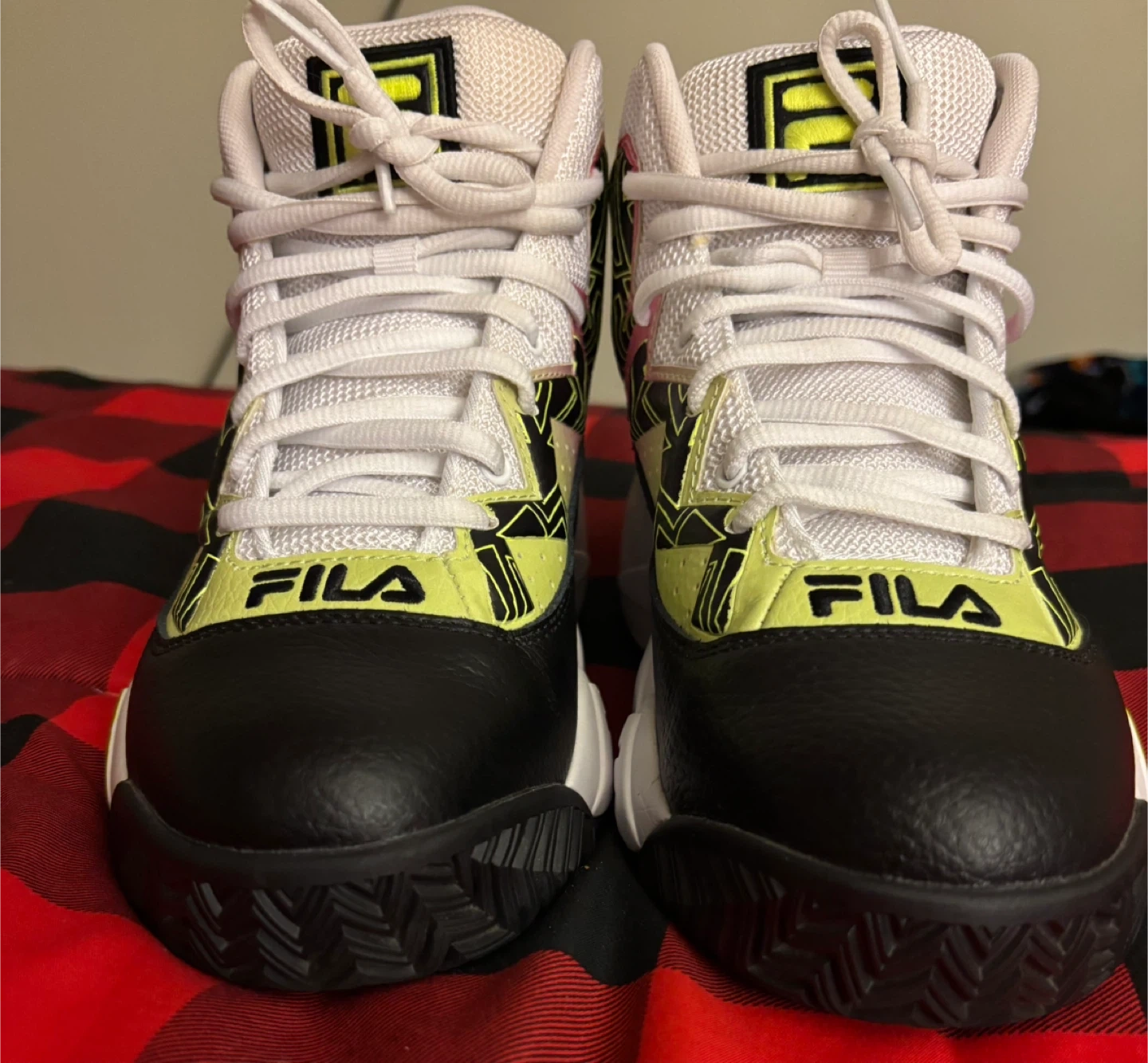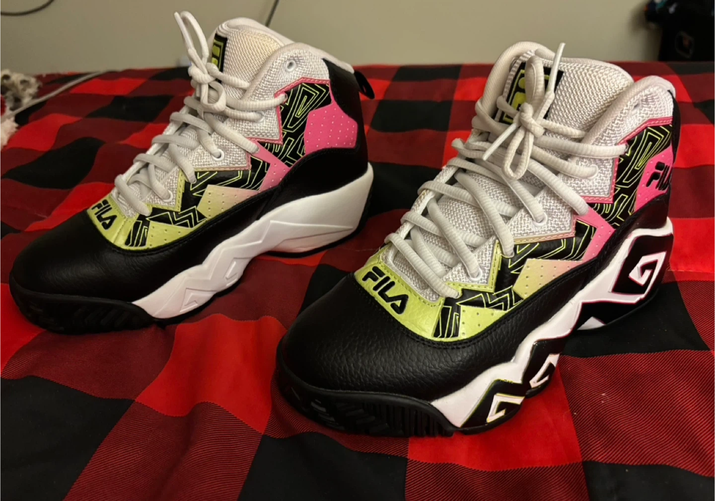 These Fila mid-top sneakers are black and white with bright yellow and pink accents. They were worn once and are in excellent condition. They feature a lace-up closure and a durable sole. Youth size 7, which equals women’s 8.5