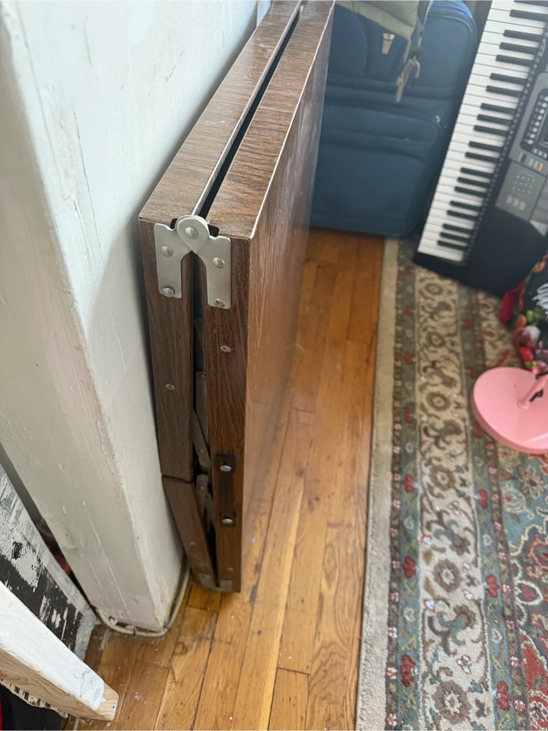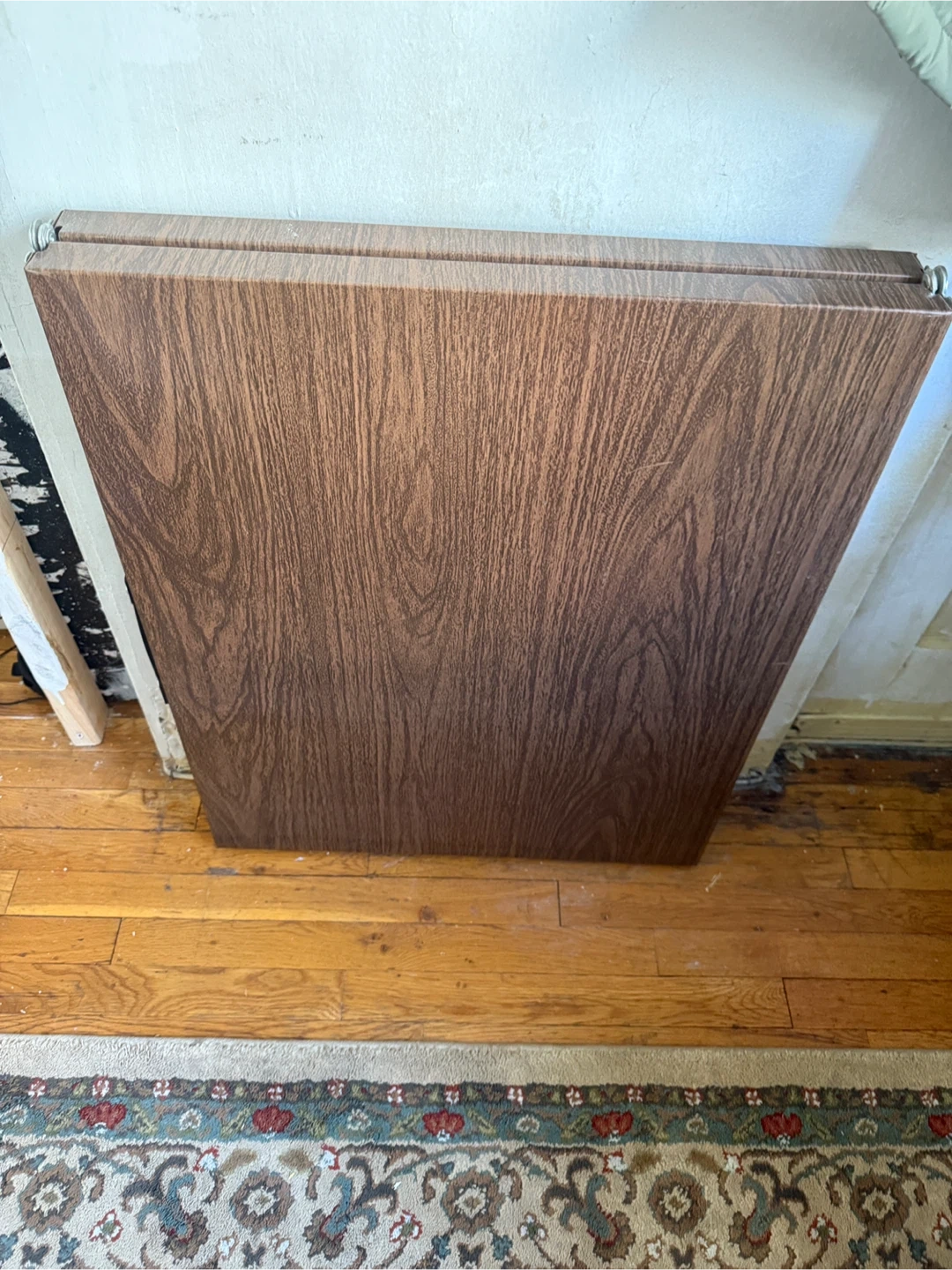 This is a foldable table top with a wood grain finish. It's hinged in the middle for easy storage. It's great for adding extra surface space when needed!