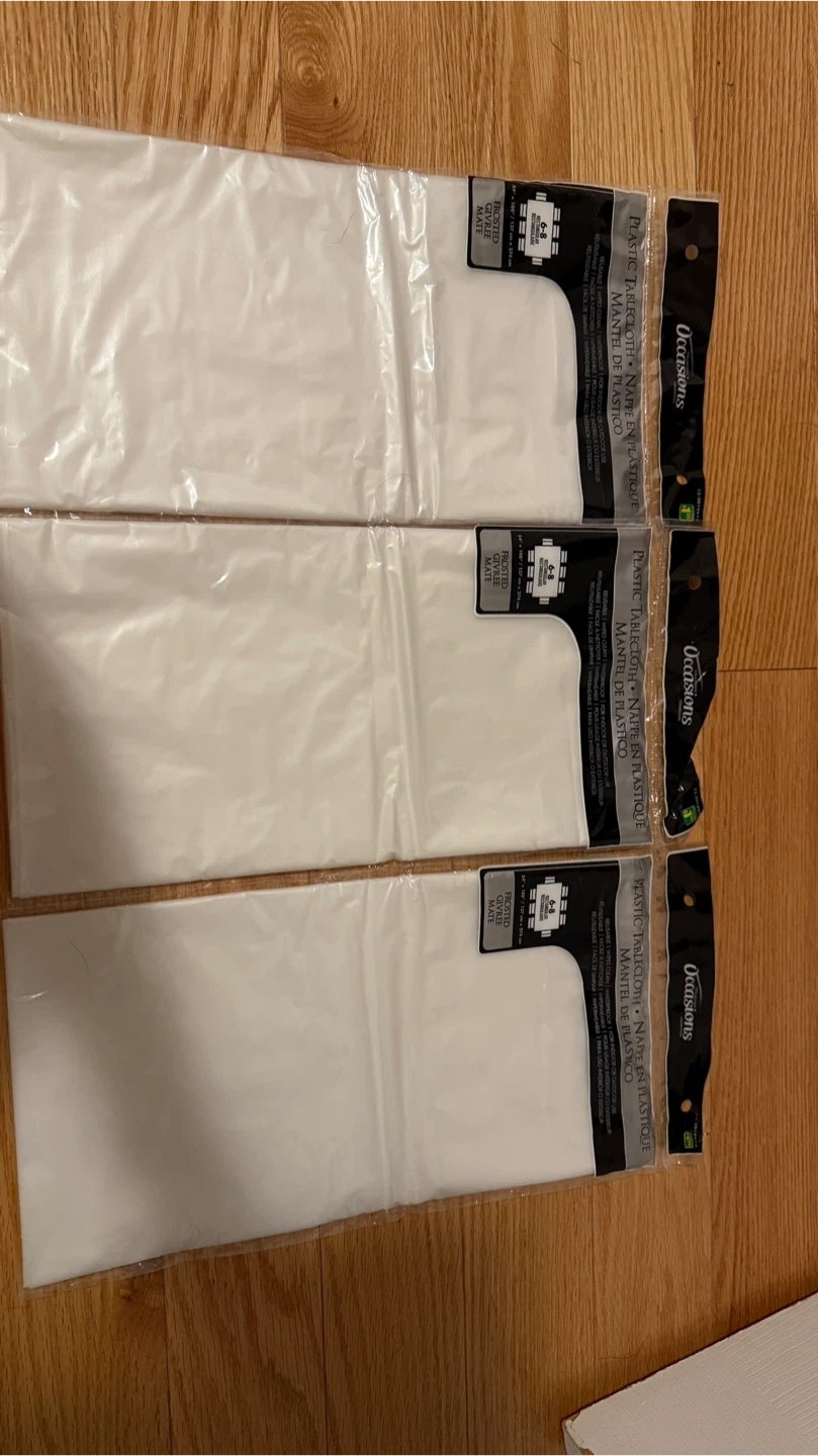 Three Occasions frosted plastic tablecloths. Reusable and wipe clean for indoor or outdoor use. Dimensions are 54" x 108" or 137 cm x 274 cm. Great for parties or everyday use!