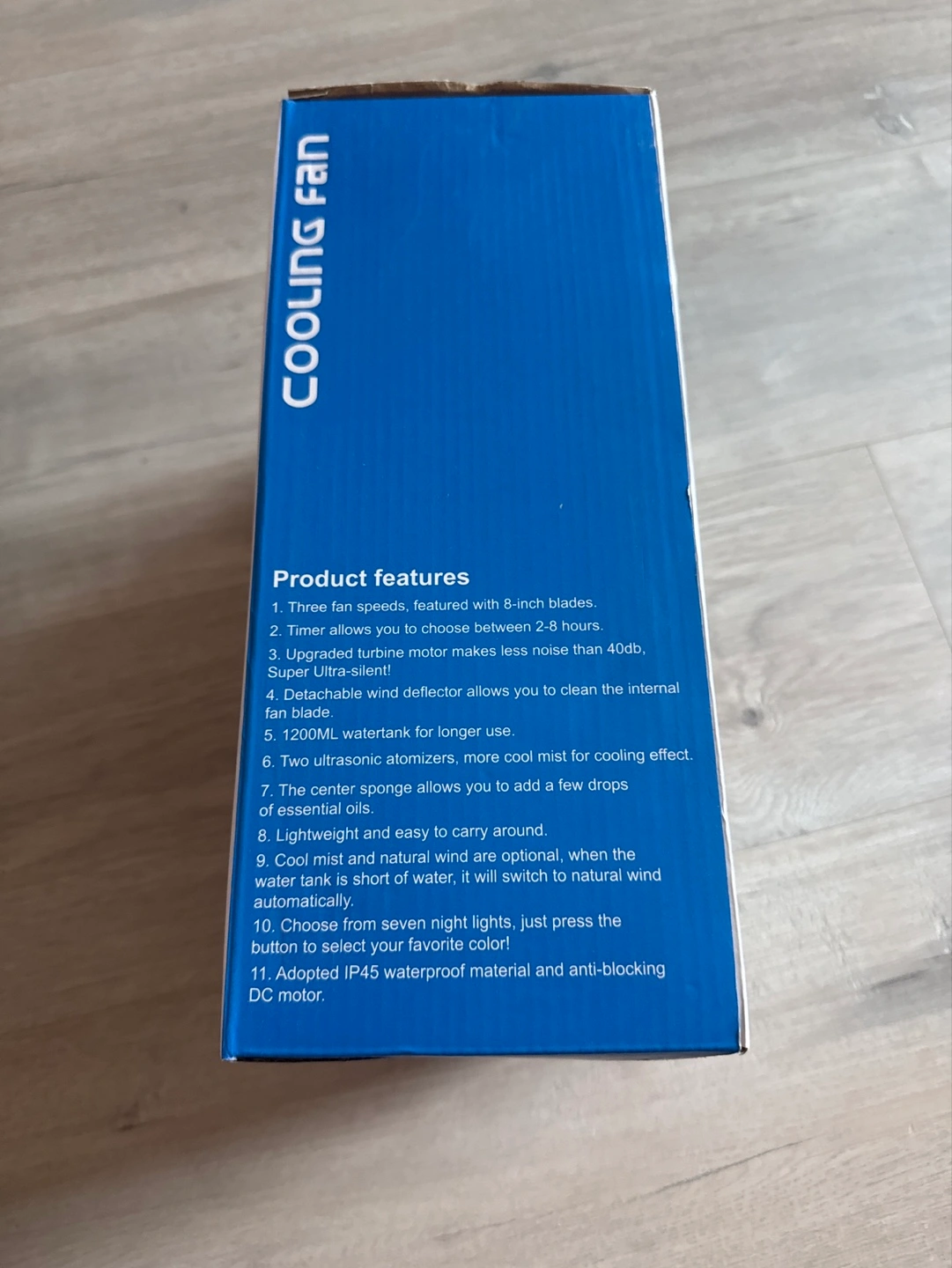 Portable fan, three speeds, 8-inch blades. Timer allows choosing between 2-8 hours. Upgraded turbine motor, less noise than 40db. Detachable wind deflector allows cleaning the internal fan. 1200ML water tank. Two ultrasonic atomizers, more mist for cooling effect. Essential oils. Lightweight and easy to carry around. Cool mist and natural wind optional. Seven night lights. Waterproof material and anti-blocking DC motor. Remote control.