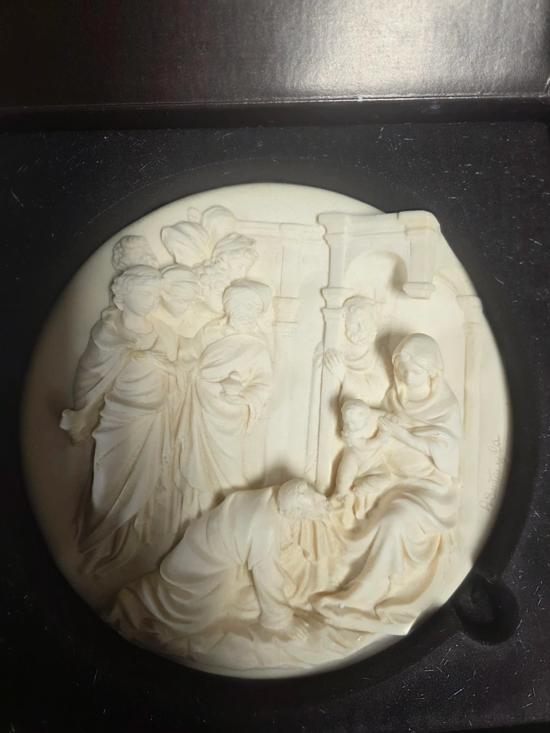 This is a "La Natività" relief plate sculpted by Alberto Santangela. It's part of a limited edition and comes with a certificate of authenticity. The piece depicts a Nativity scene with intricate details.