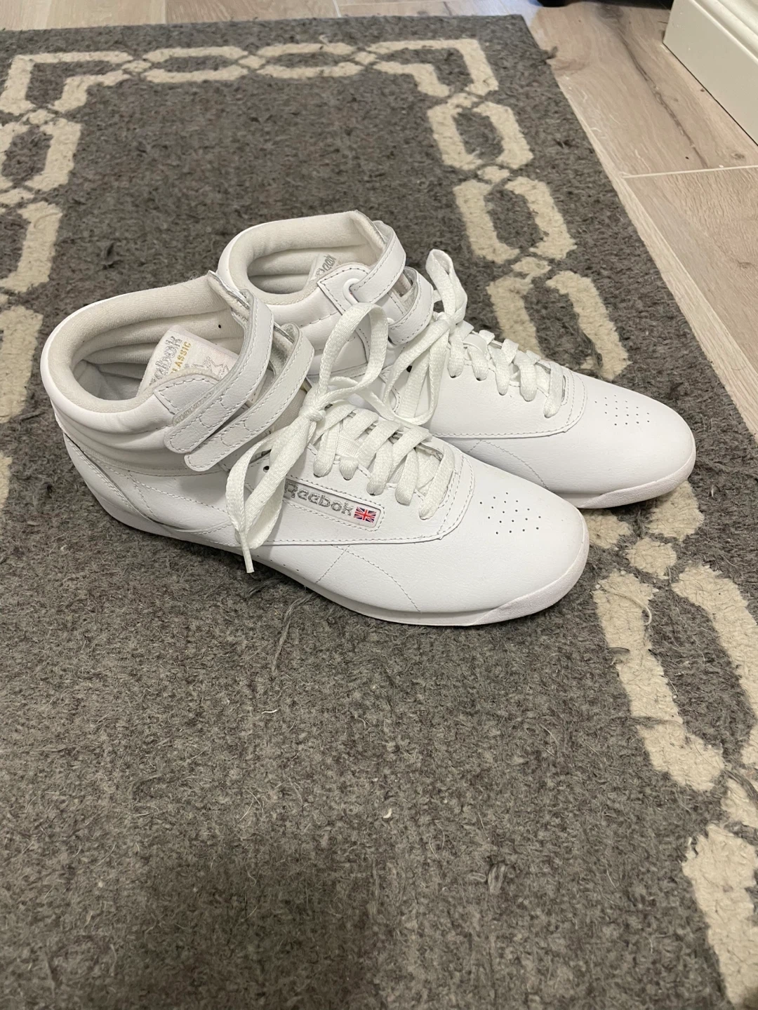 Classic white Reebok Freestyle Hi sneakers for women. They feature a mid-top design with hook-and-loop ankle straps for a secure fit. Leather upper and rubber sole. Only have been worn inside, they have been sitting in my closet for a year