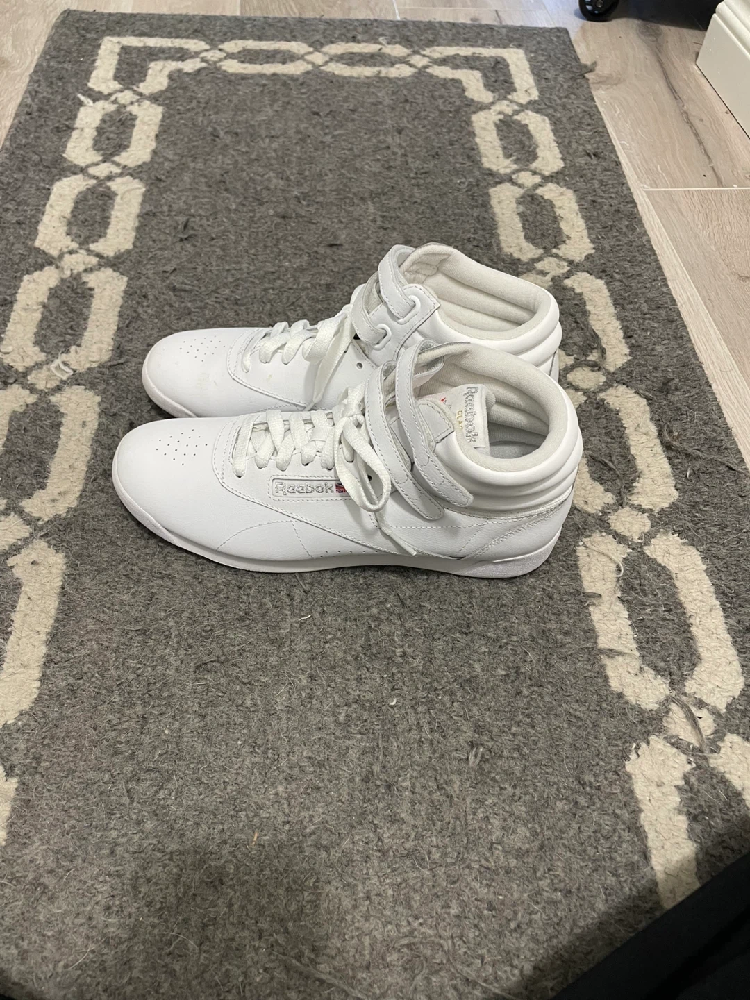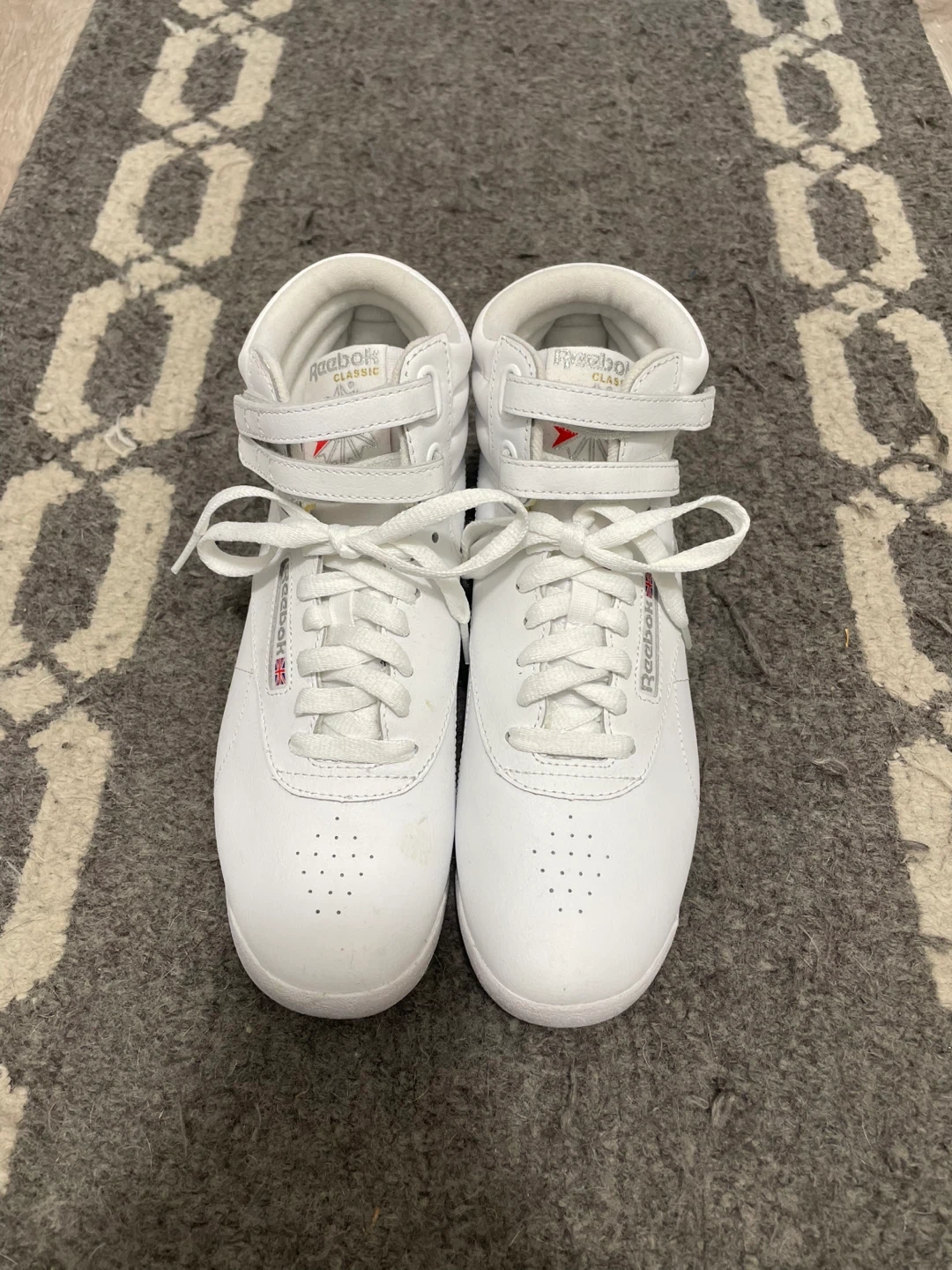 Classic white Reebok Freestyle Hi sneakers for women. They feature a mid-top design with hook-and-loop ankle straps for a secure fit. Leather upper and rubber sole. Only have been worn inside, they have been sitting in my closet for a year