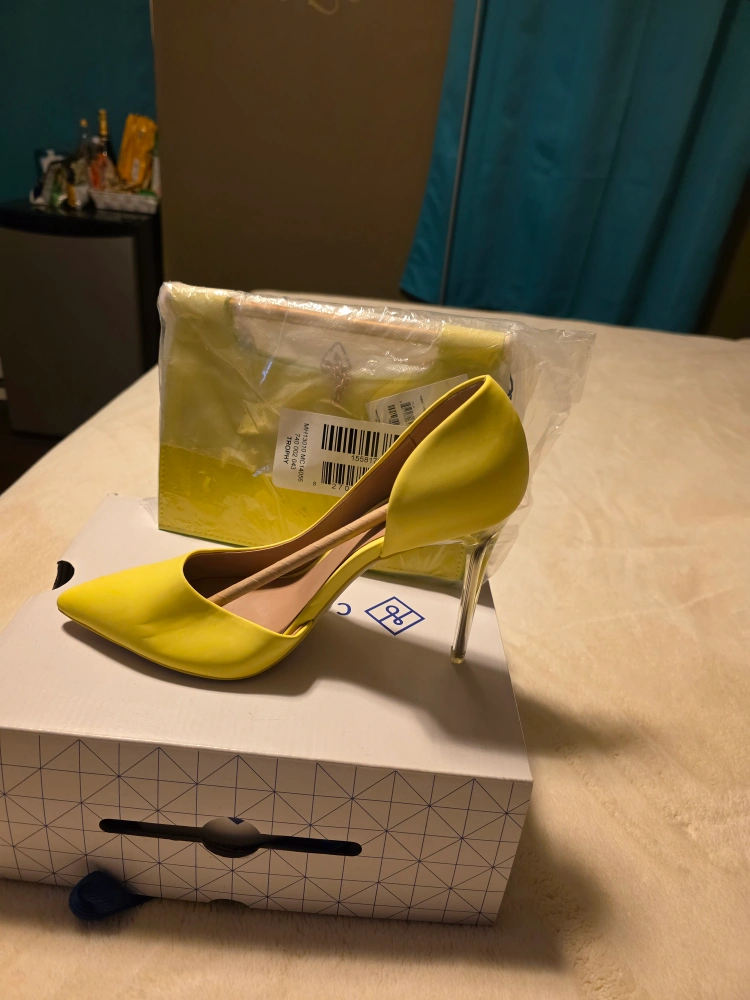 Selling a pair of brand new ALDO heels in a vibrant yellow colour, size 8. These heels are in excellent condition and come with the original box withe the yellow purse