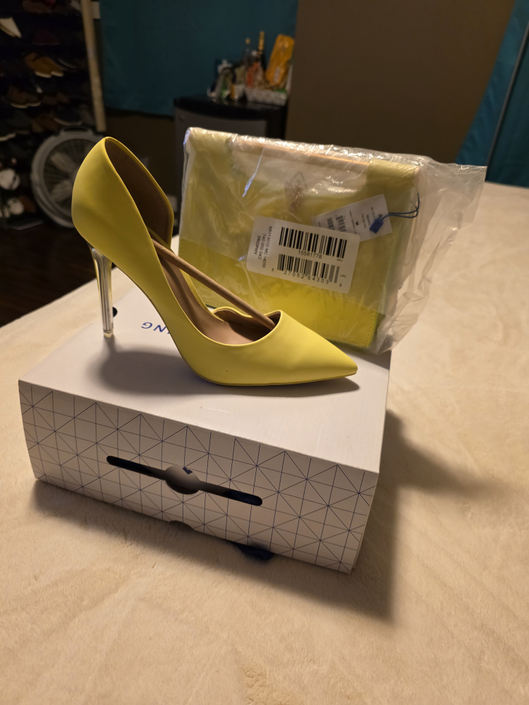 Selling a pair of brand new ALDO heels in a vibrant yellow colour, size 8. These heels are in excellent condition and come with the original box withe the yellow purse