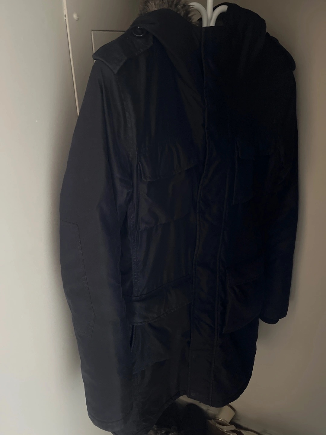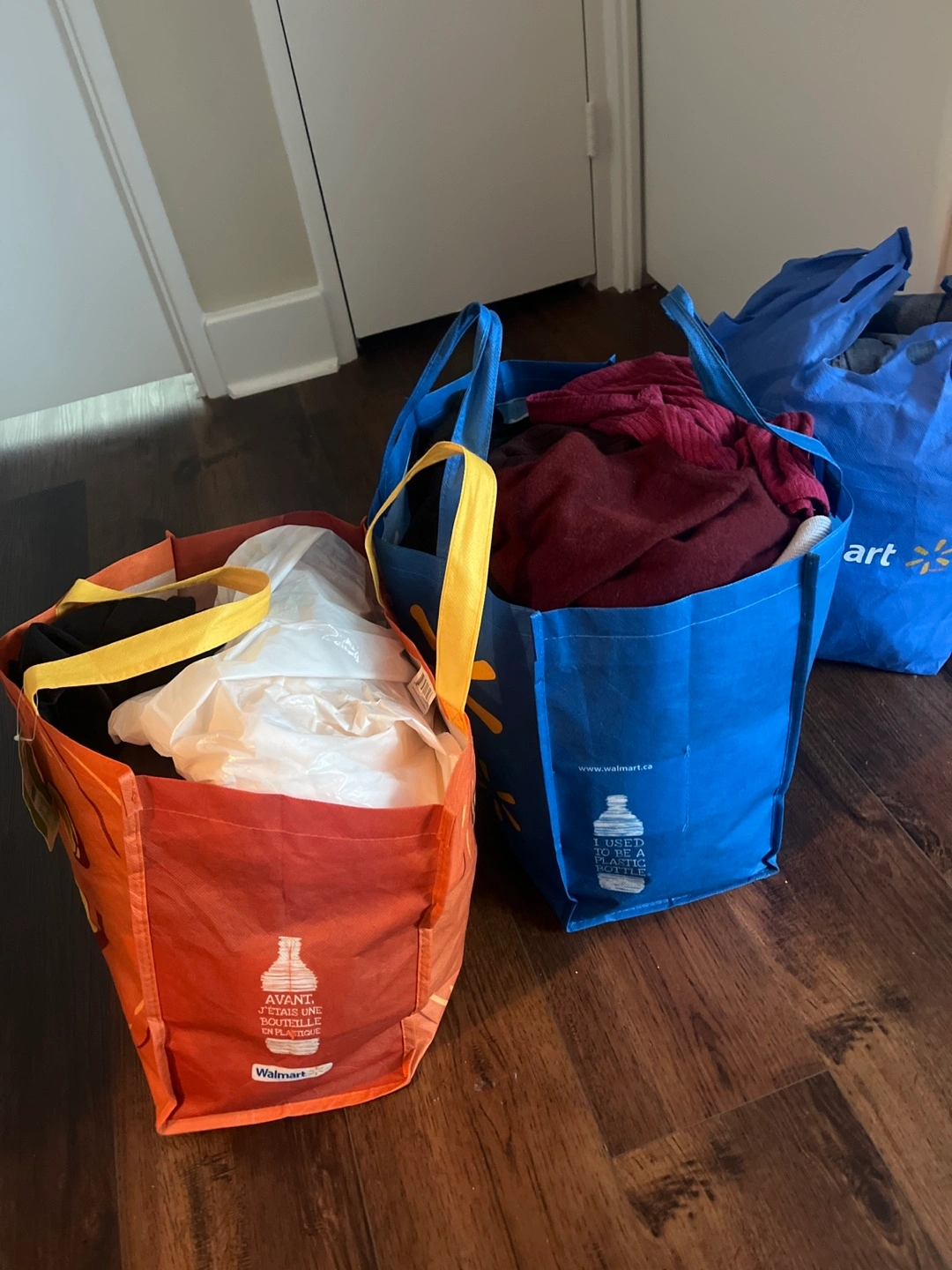 Winter jacket size Small with detachable fur. 3 bags full of clothes, scarf, tops, pants, jeans etc
