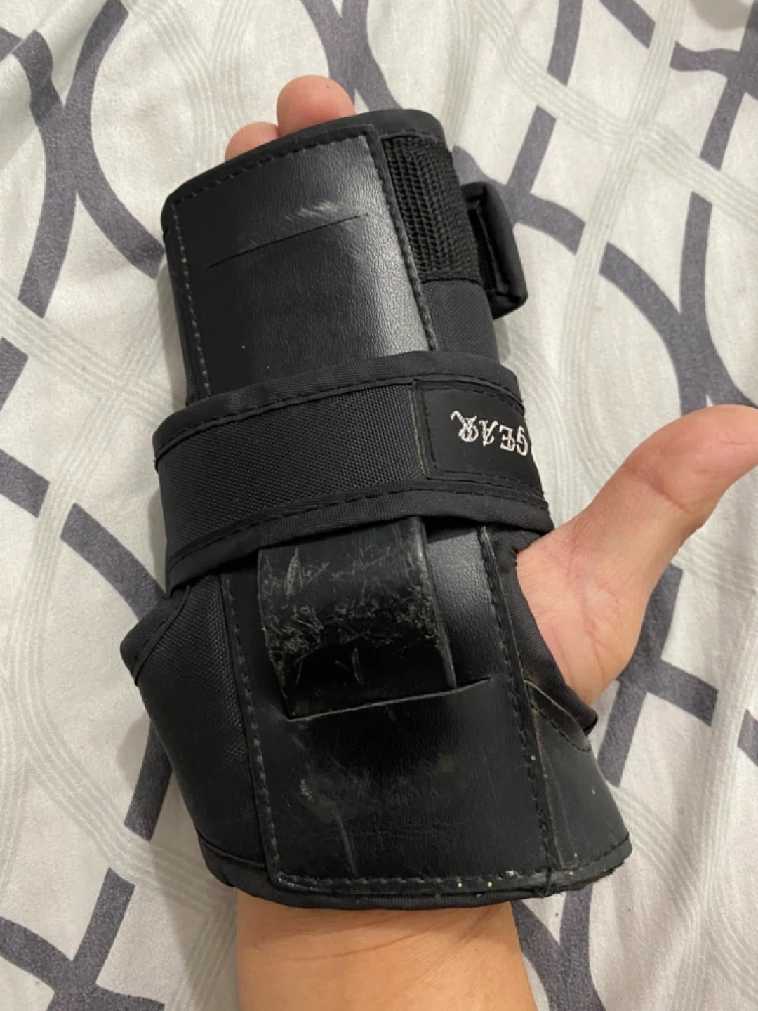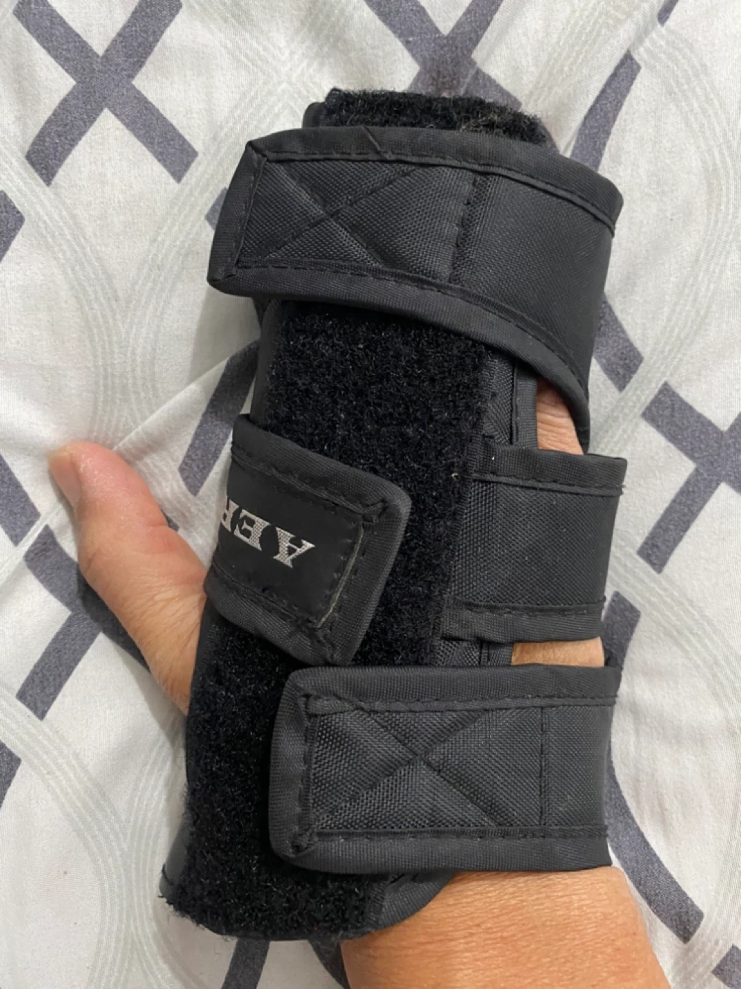 Selling a black AER Gear wrist support. It shows some signs of wear, but is still functional. Great for providing support during workouts or other activities!