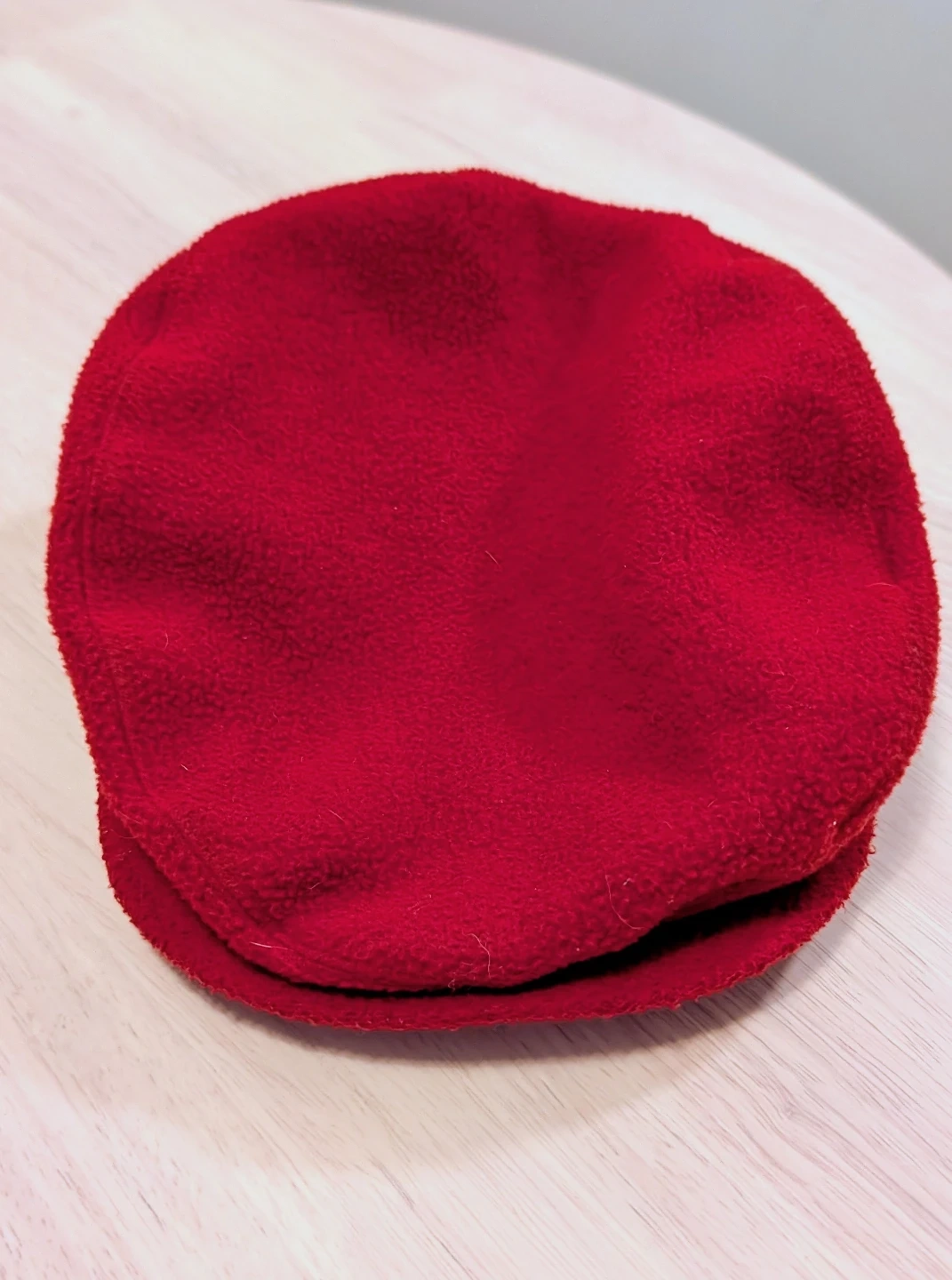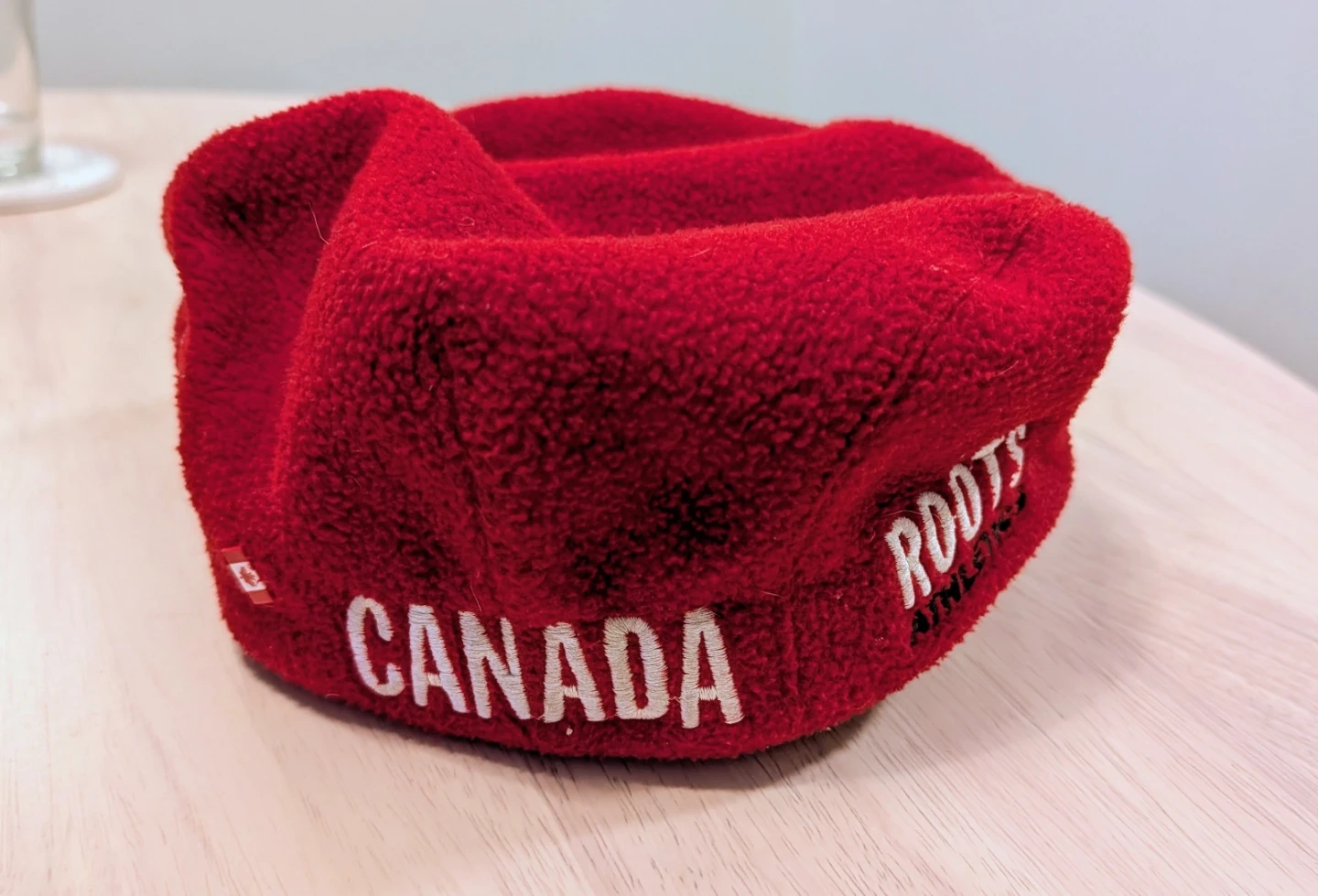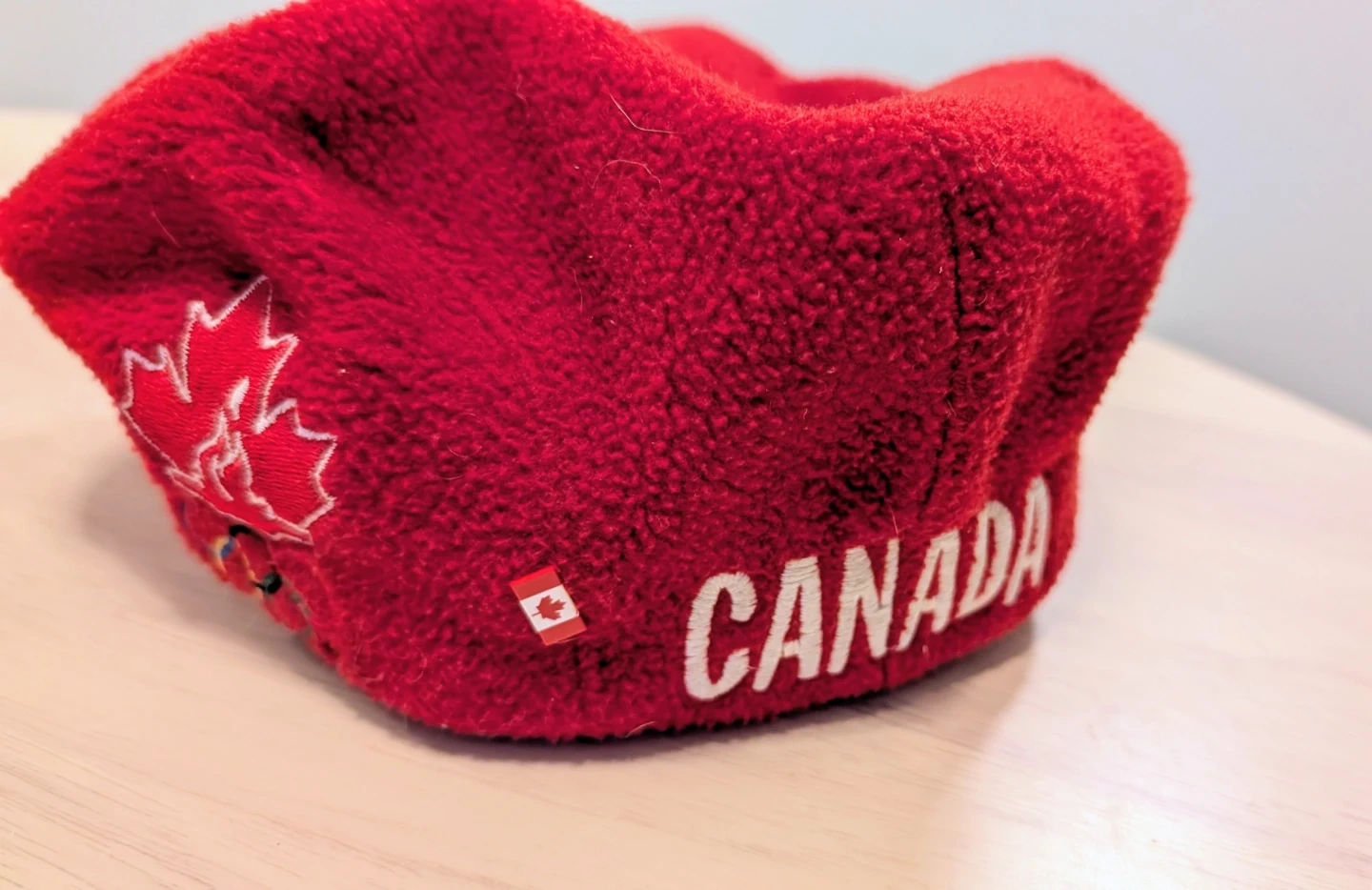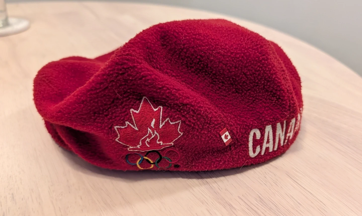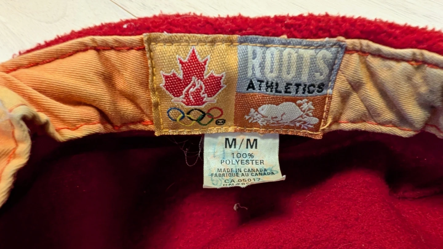 Red fleece flat cap with "CANADA" embroidered on the side, along with a Canadian flag accent. It also features the Canadian Olympic maple leaf logo. Made by Roots.