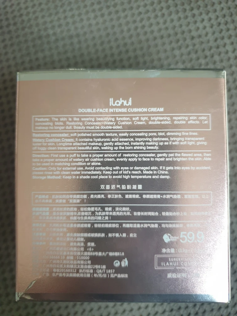 Double-face intense cushion cream. Features: The skin whitening, beautifying function. Soft light, brightening, repairing skin color, restoring blots. Restoring, Concealer-Watery, Cushion Cream, double-sided, double effects. Left makeup no longer dull. Beauty must be double-sided, easily concealing pore, blot, dimming fine lines. Restoring concealer, soft polished smooth texture. Direction: First use a puff to take a proper amount of essence, improving darkness, bringing the flawed areas of the skin back to its original state. Then use a cushion powder puff to gently pat the makeup evenly, transparent, oily-clean transparent beautiful skin, waking up the born shining beauty. Watery cushion cream. It contains hyaluronic acid restoring concealer, gently pat the light, giving a proper amount of water, avoid contacting with eyes or face to repair skin. It brings the bright skin, then makes the skin more shiny and delicate. Caution: Only for external use. Avoid contact, keep of kid's reach. If it gets into eyes by accident, please rinse with clean water immediately. Cushion Cream, evenly apply, and brighten the skin. Avoid storage in hot and damp places to avoid the high temperature and damp.
