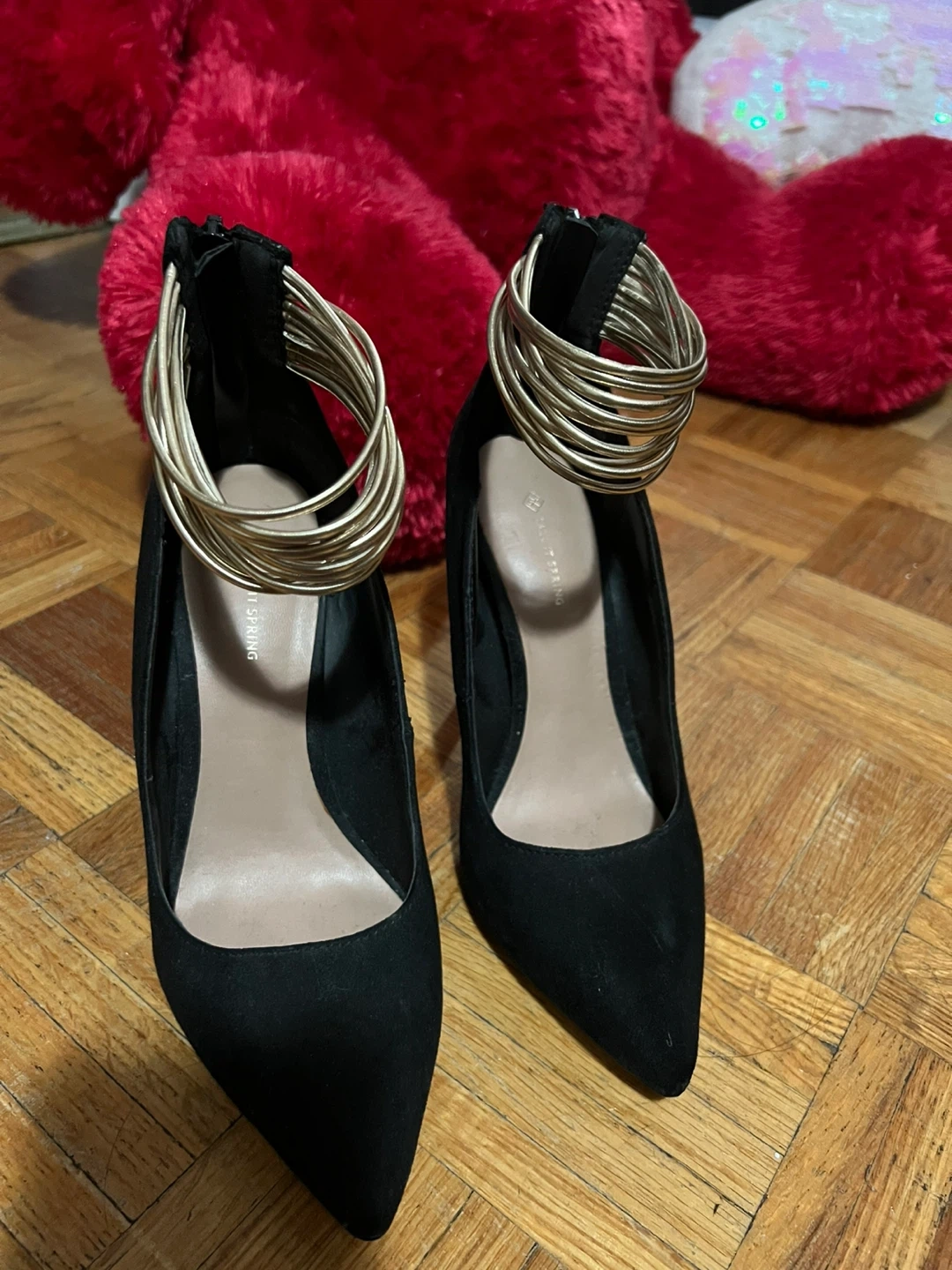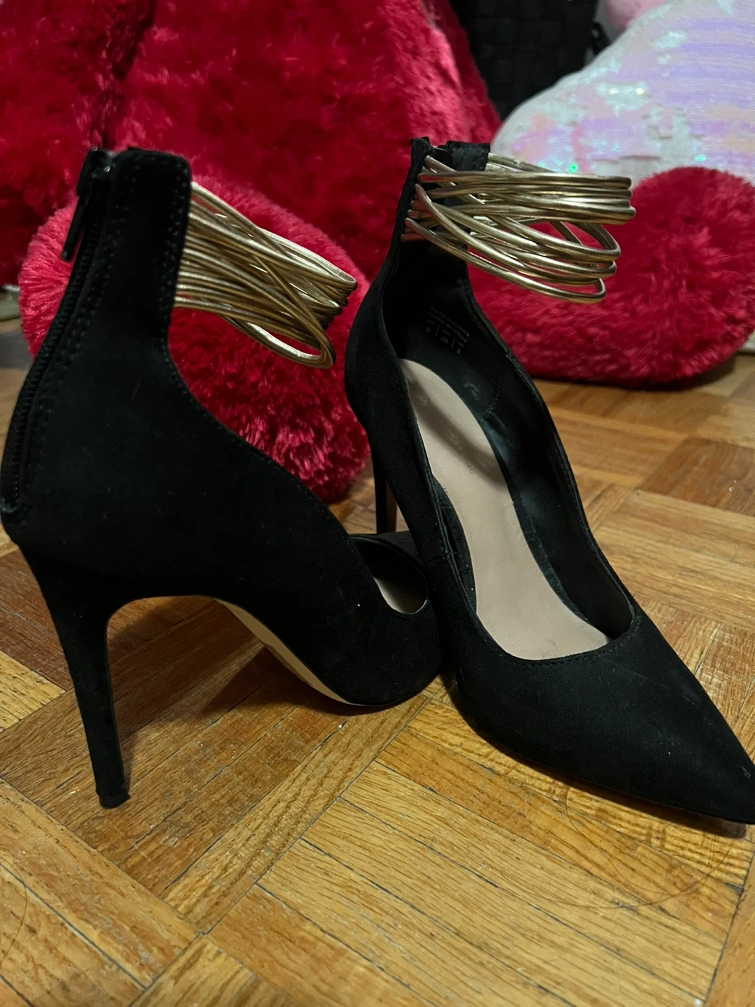 Selling a pair of Call It Spring black heels. They have a unique design with gold-tone accents around the ankles. These heels are in great condition and ready for a new home