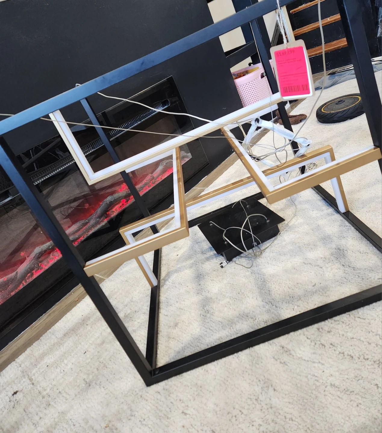 This ET2 Lighting pendant features a modern cube design in black and gold. It's made of steel and aluminum with integrated LED bulbs. The height is adjustable and it's dimmable with a compatible dimmer.