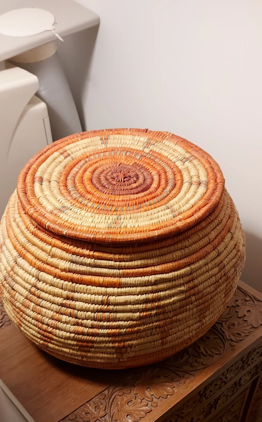 This hand-woven basket features a lid and a natural straw colour with orange and green accents. Woven in the Arabian peninsula with a suede-covered bottom, it's perfect for storing small items or as a decorative piece.