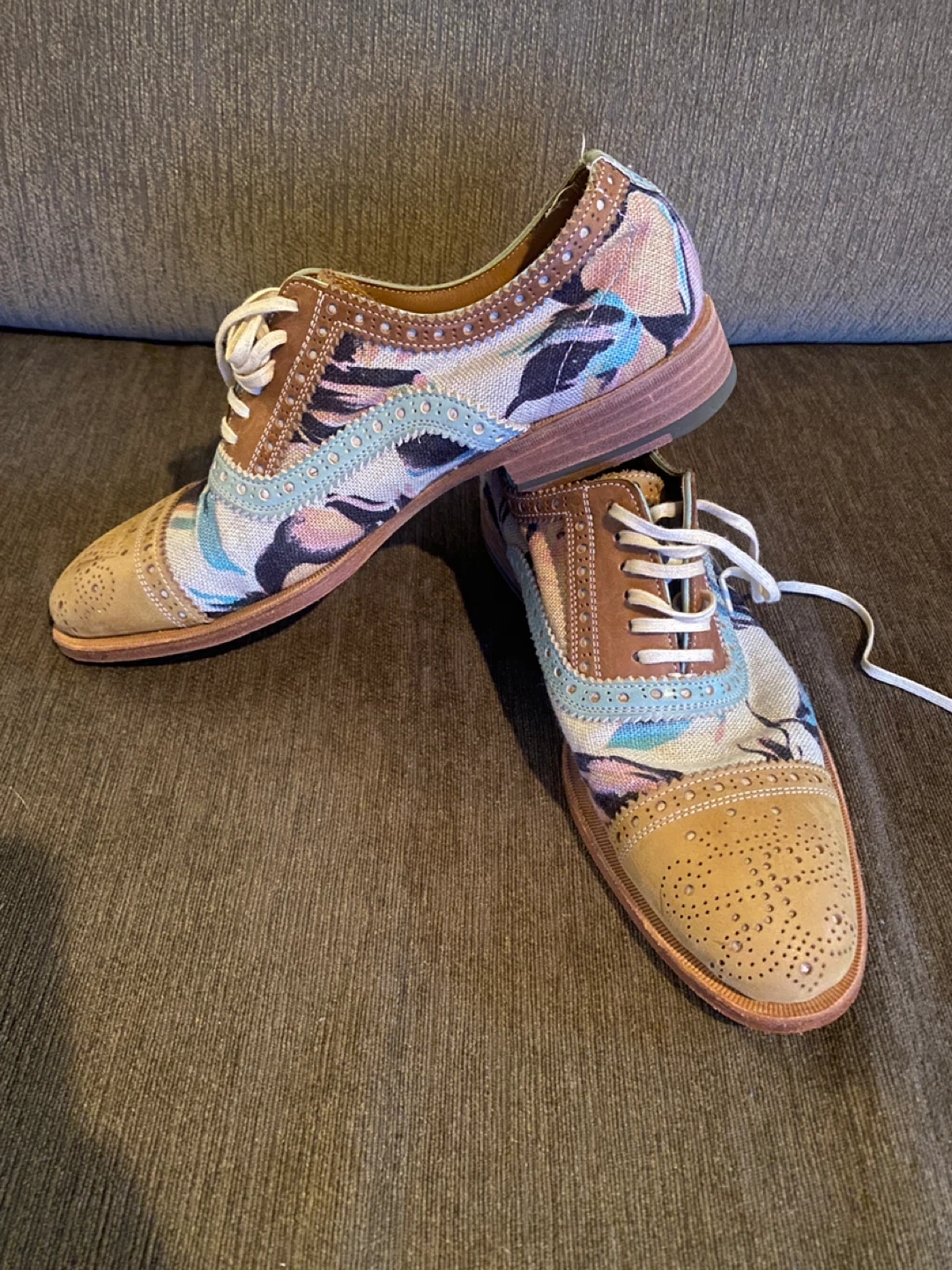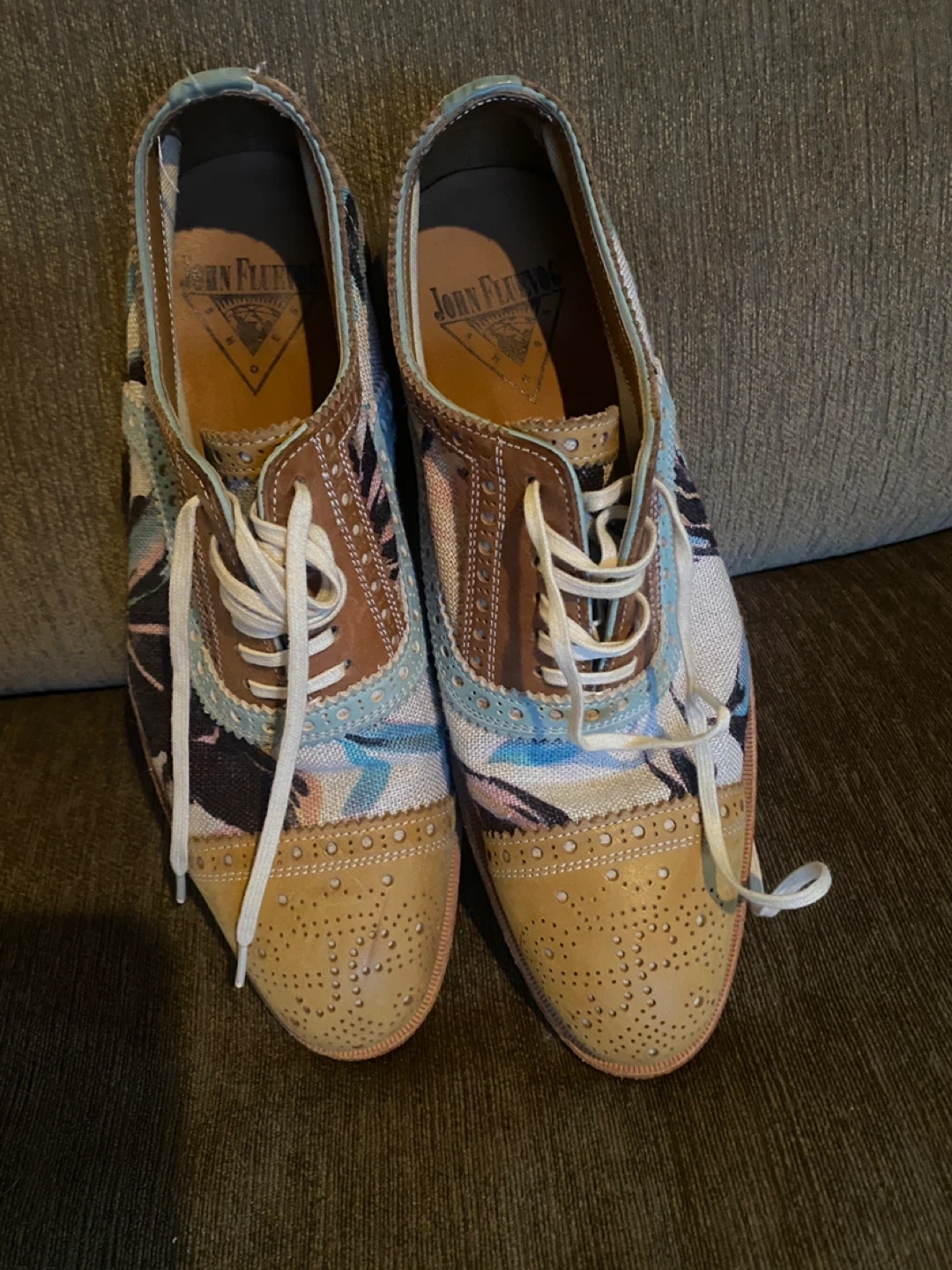 Stylish John Fluevog oxfords with a vibrant floral print.