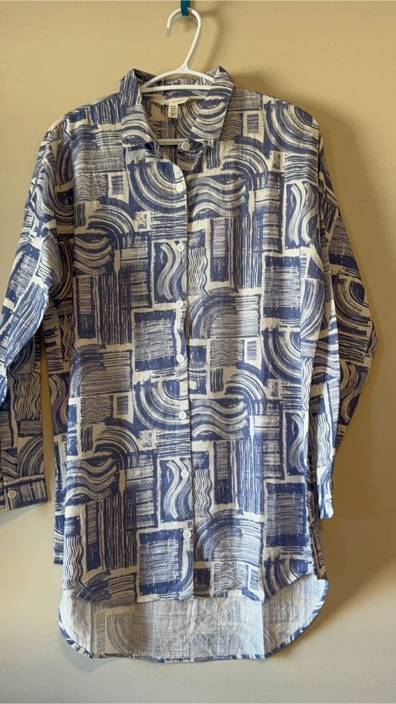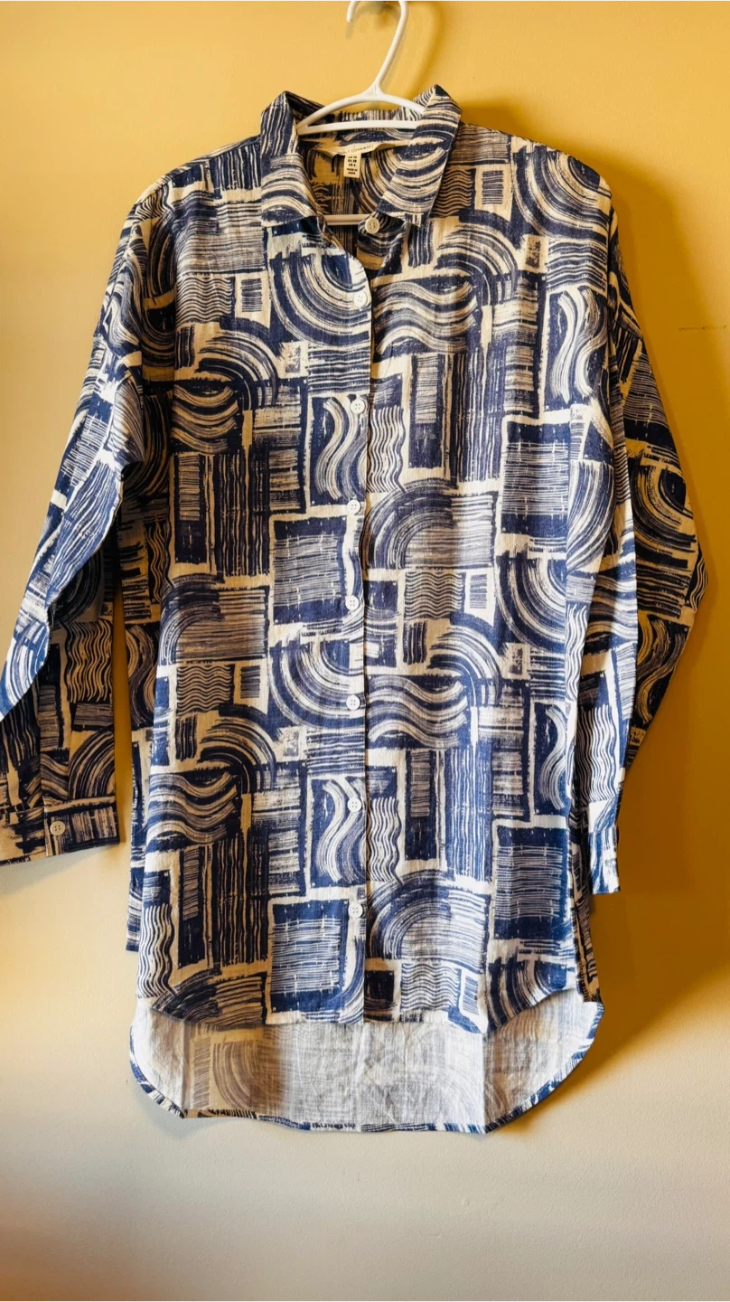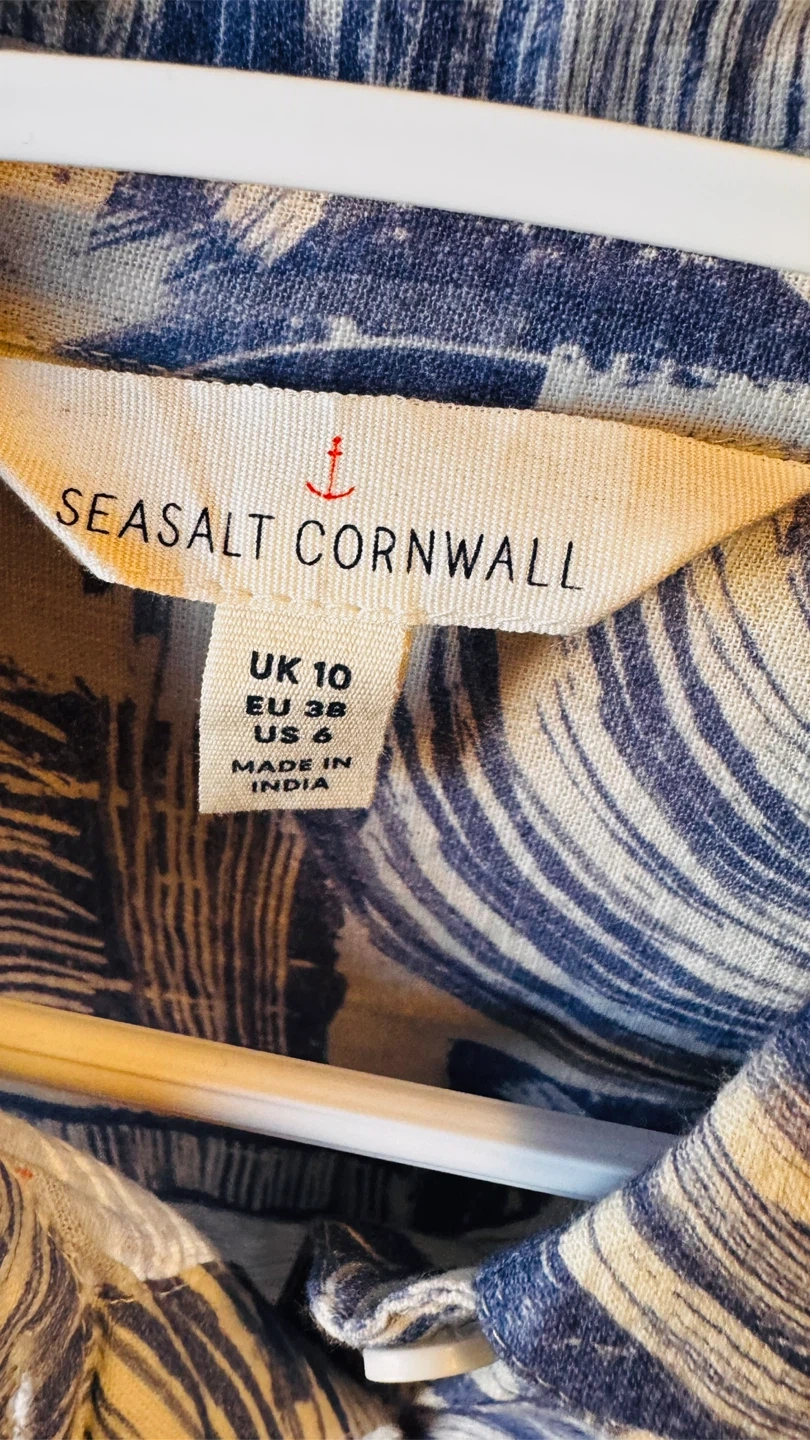 Selling a lovely Seasalt Cornwall shirt with a unique blue pattern! It's a women's size US 6. The tag indicates it's made in India.