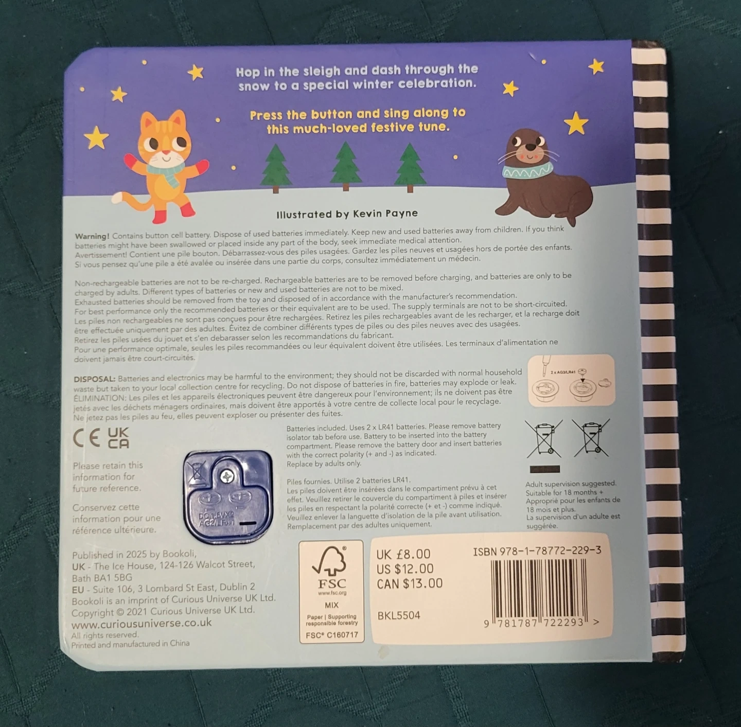 This Bookoli board book features the "Jingle Bells" song with interactive buttons. It's designed for little ones to sing along and has a durable cover. Requires 2 LR44 batteries, which are included, but need to be changed.