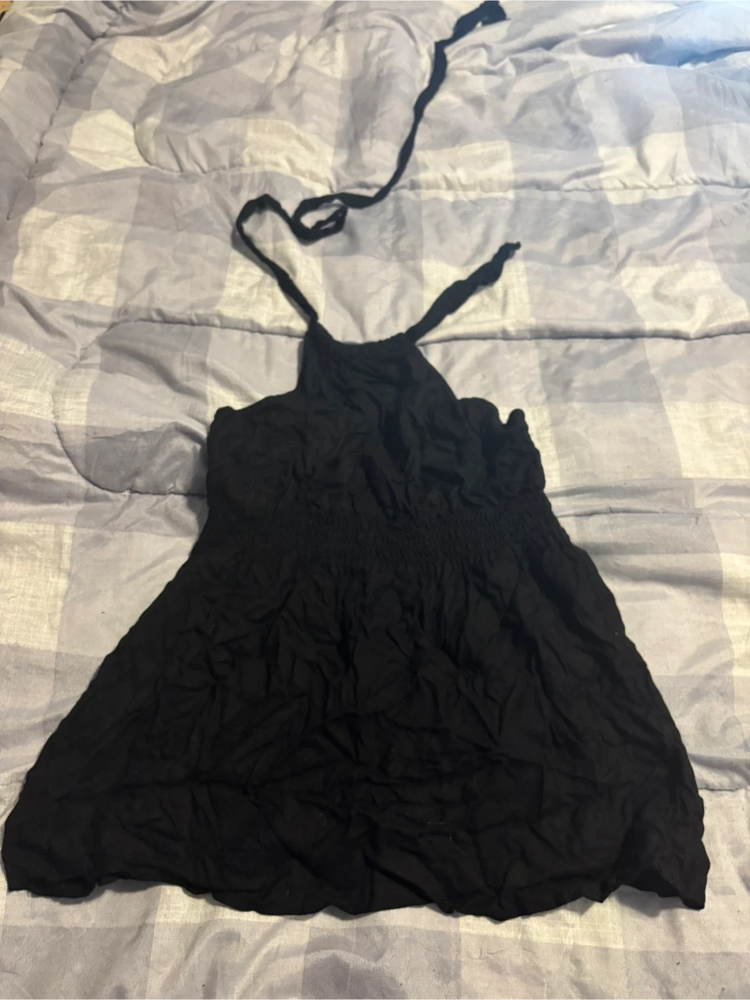 This is a black Guess halter top. It's a size M/M with smocking detail on the bodice. The halter straps tie at the back. A simple and stylish addition to your wardrobe!