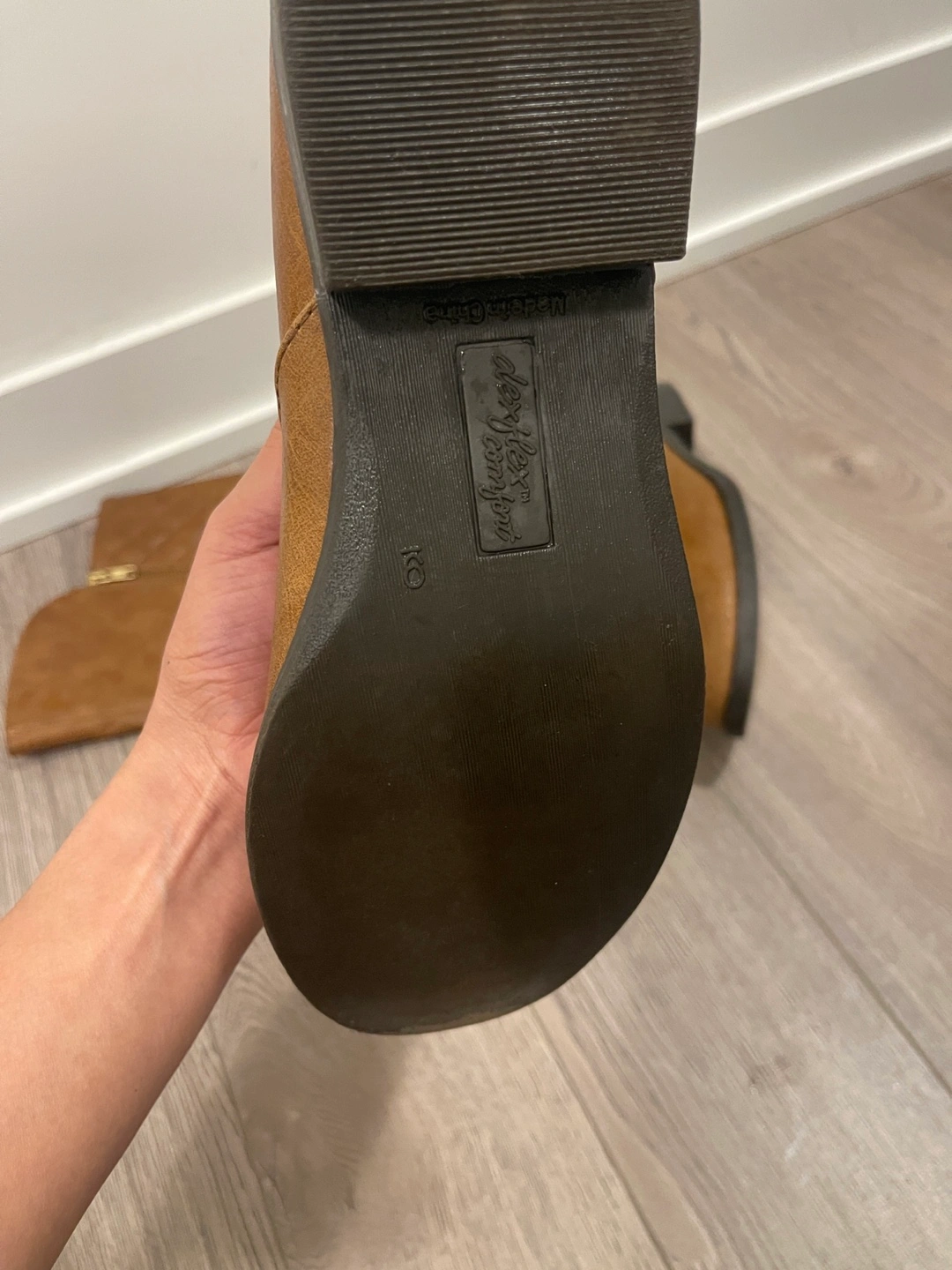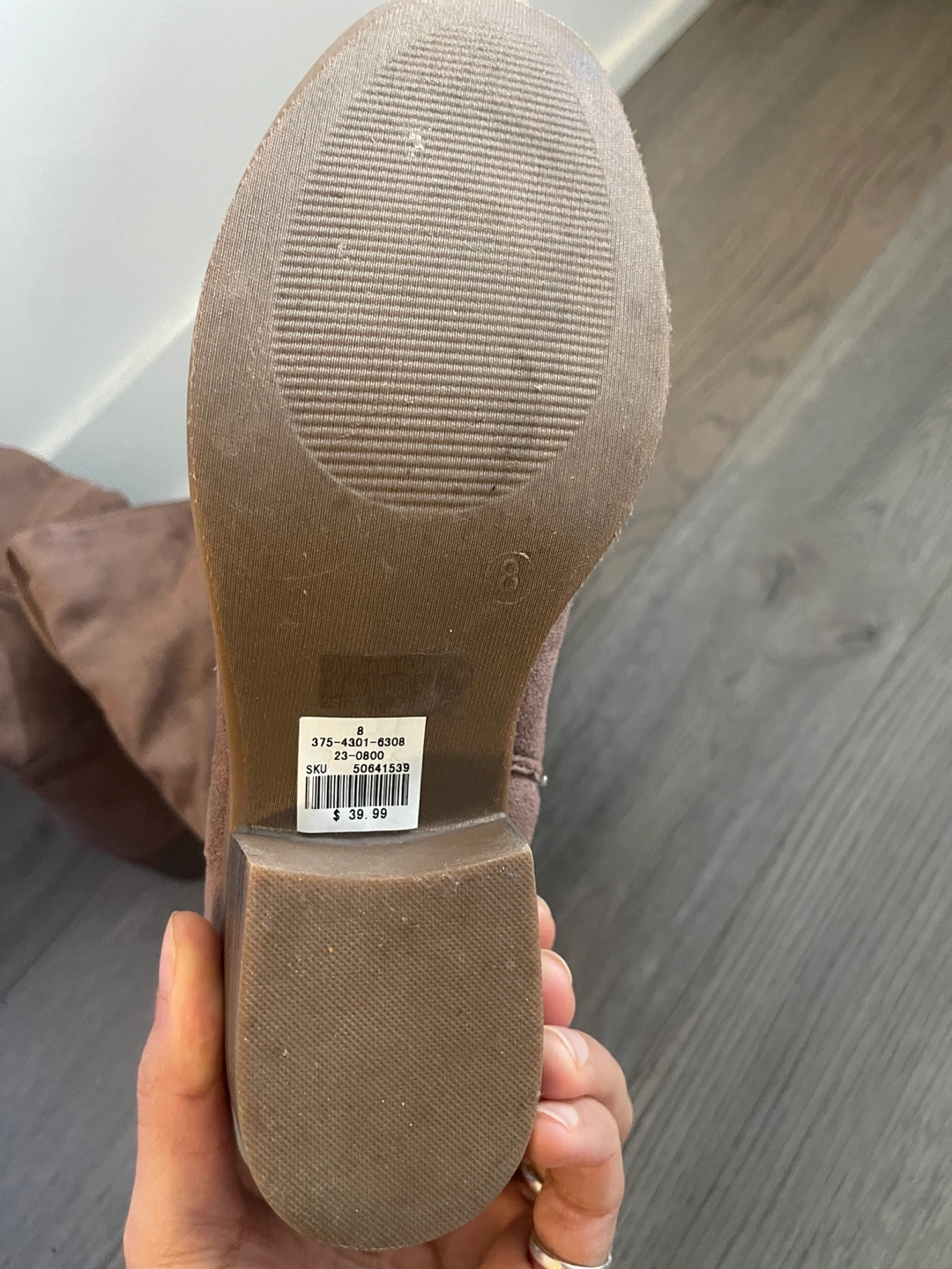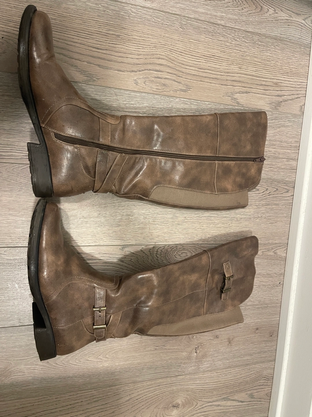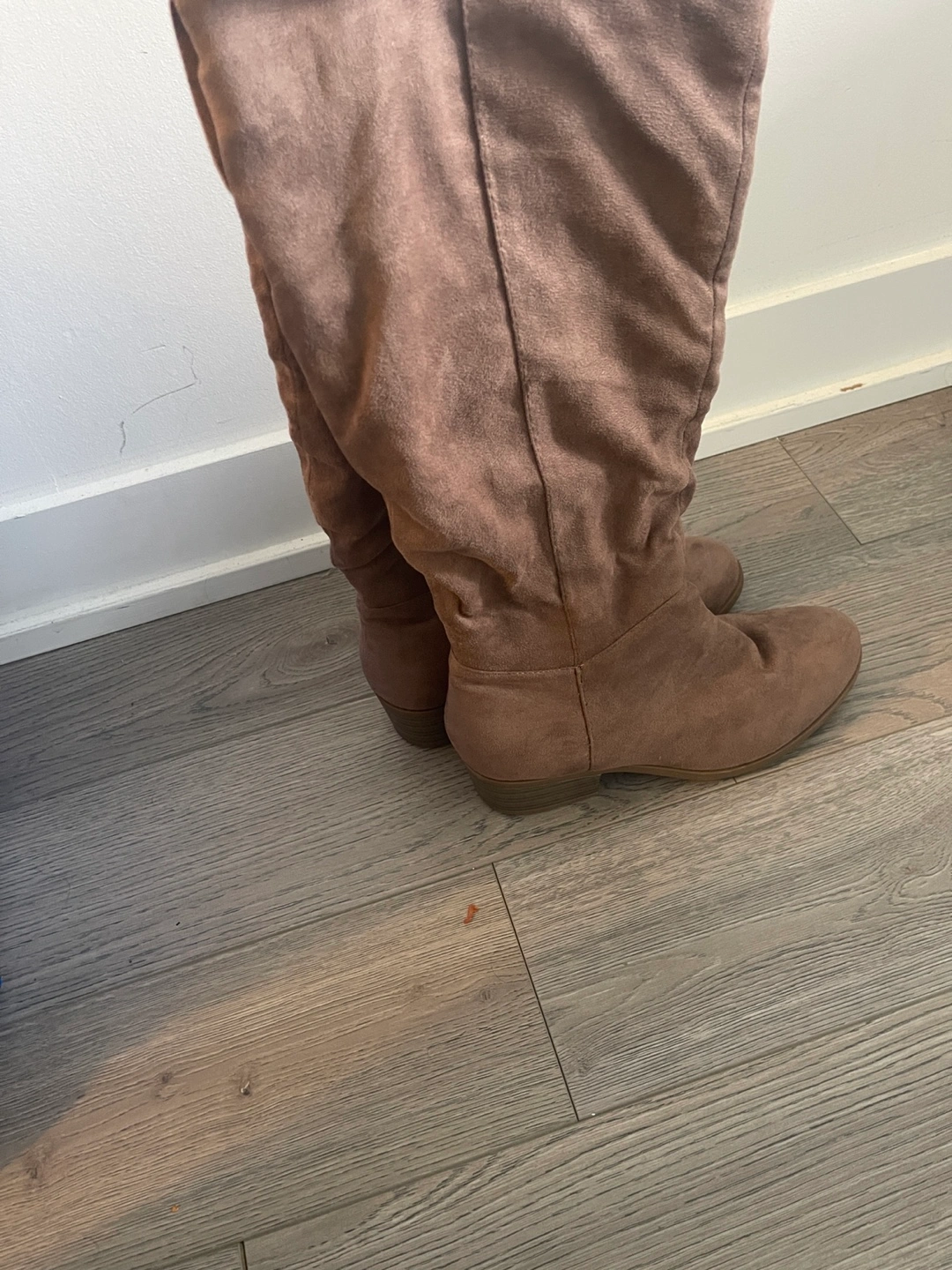 Brown knee high boots with a side zipper. The boots have a small heel and a quilted design on the upper half of the boot.