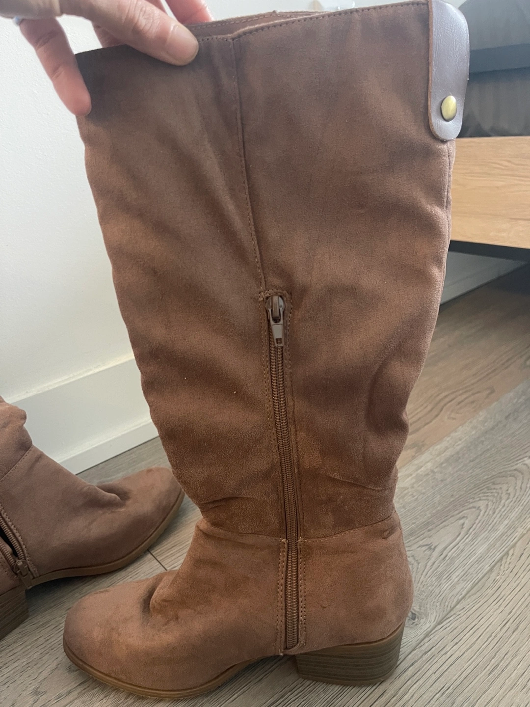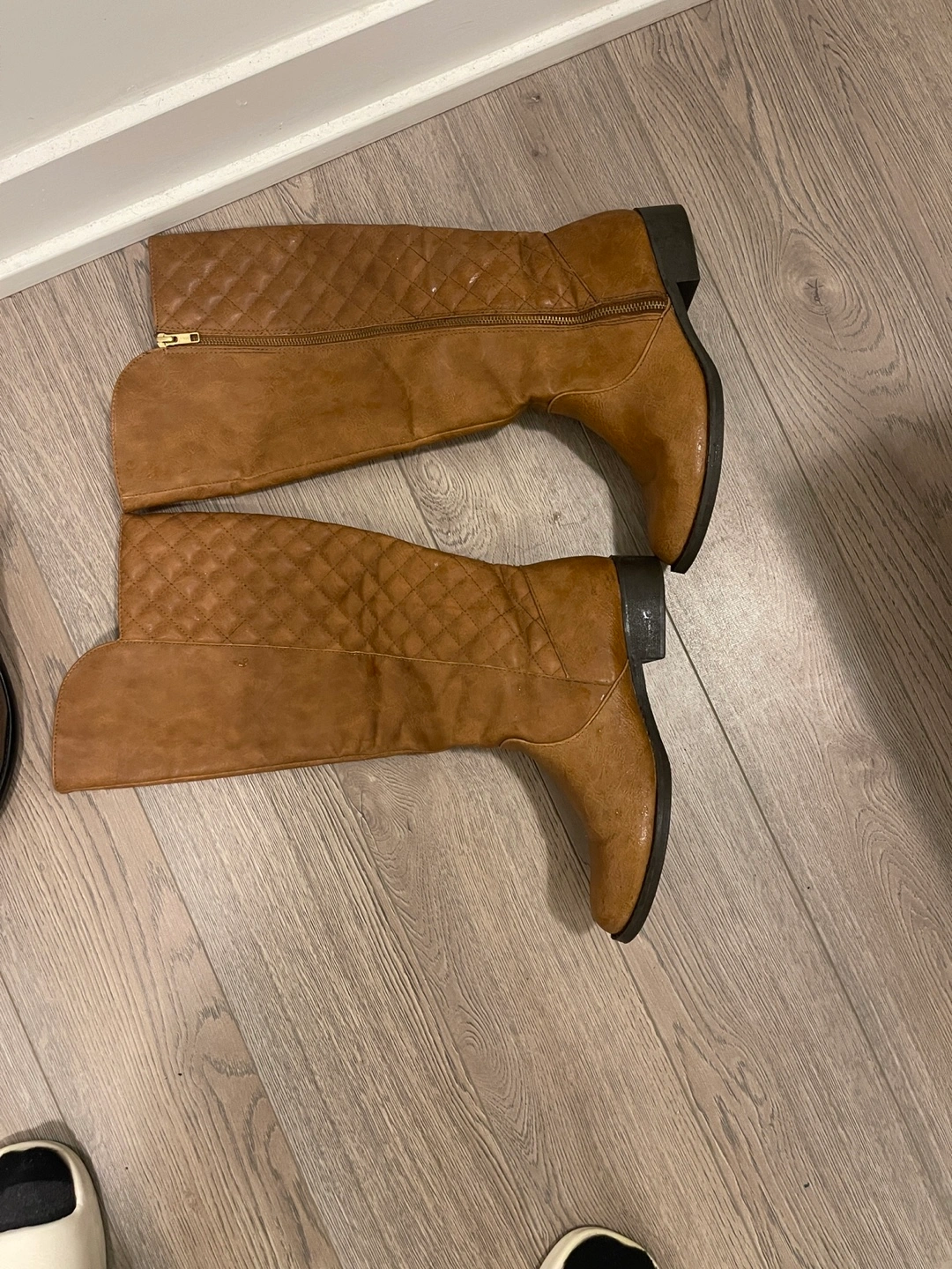 Brown knee high boots with a side zipper. The boots have a small heel and a quilted design on the upper half of the boot.