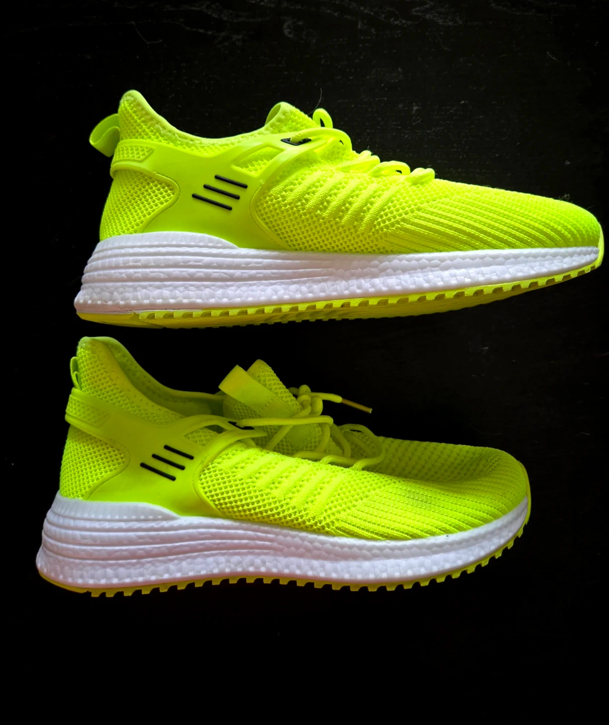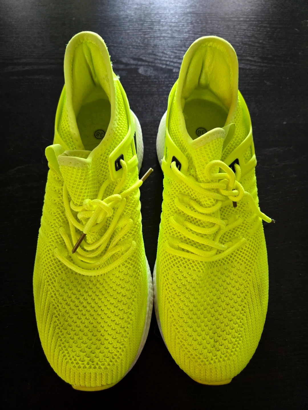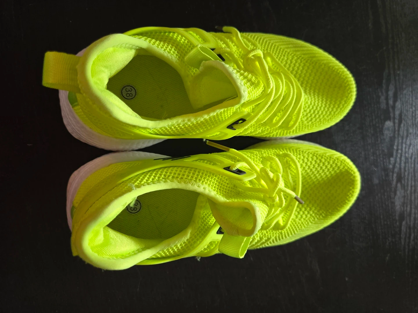 New from Amazon. These neon green shoes are a womens size 38/7. They feature a breathable mesh upper and a cushioned sole. Perfect for everyday wear or light jogs!