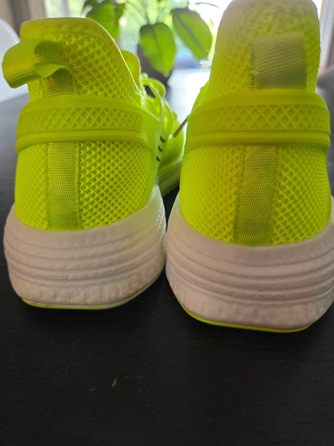 New from Amazon. These neon green shoes are a womens size 38/7. They feature a breathable mesh upper and a cushioned sole. Perfect for everyday wear or light jogs!