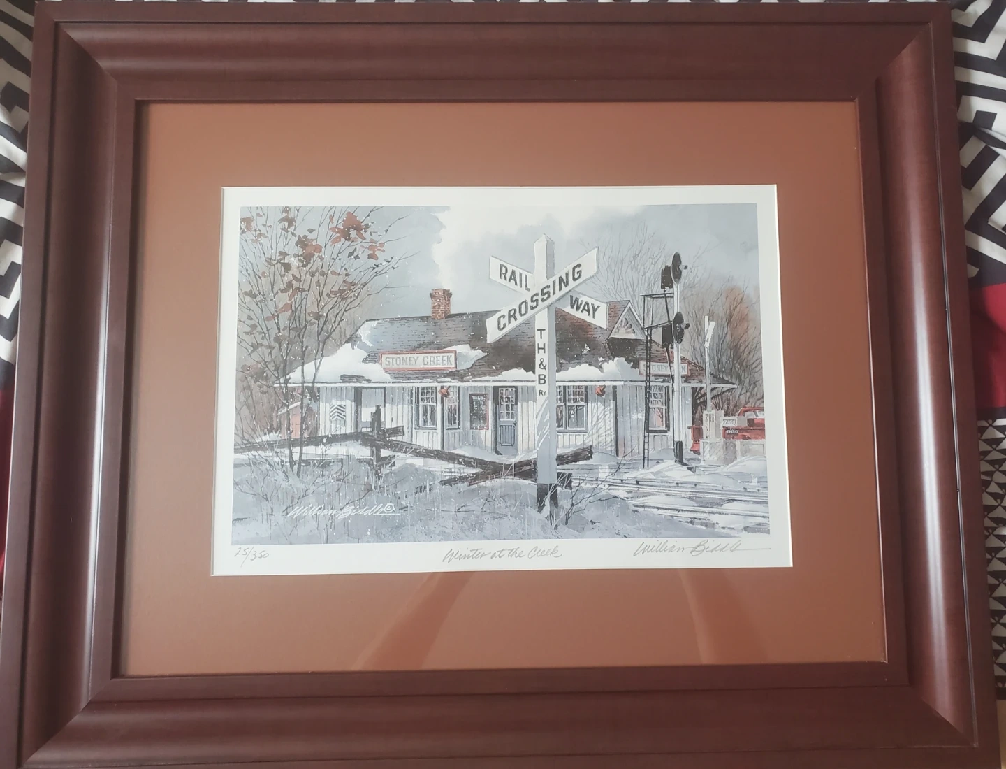 This is a framed art print titled "Winter at the Creek" by William Biddle. It's number 25 out of 350. The print depicts a snowy railway crossing with the Stoney Creek TH&B station. It's a lovely piece for any train enthusiast or collector!