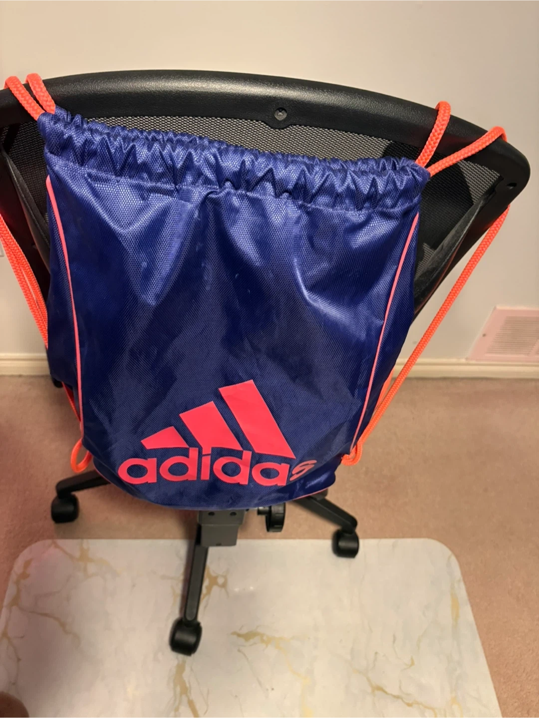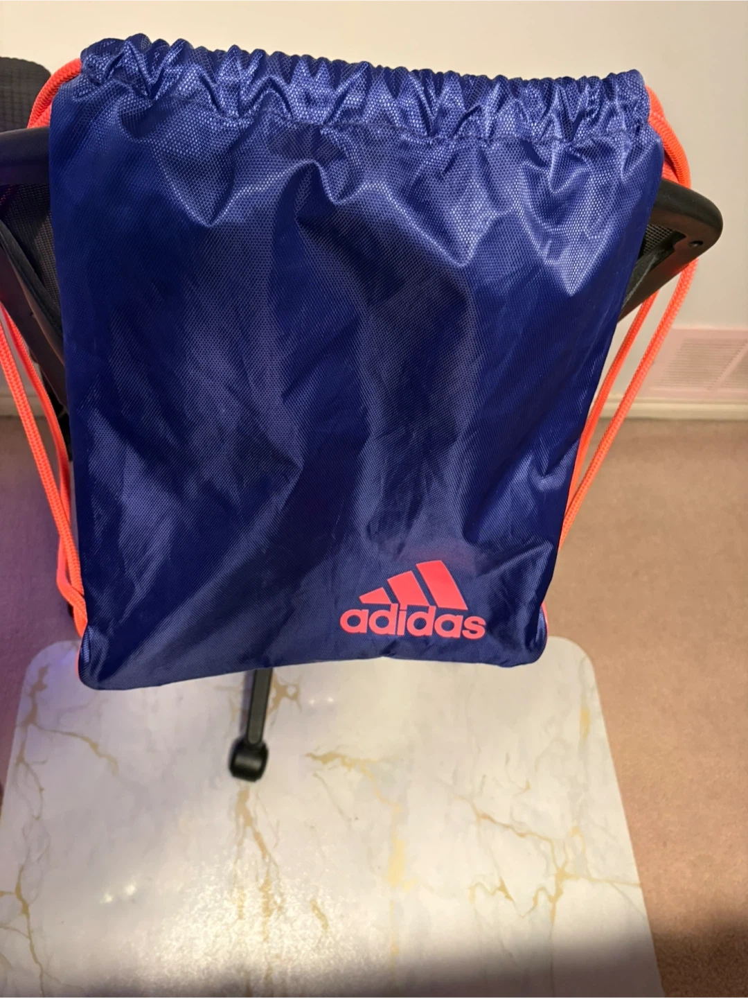 This Adidas cinch sack backpack is a versatile gym bag. It's made of durable material and features bright orange drawstrings and trim. Perfect for carrying your essentials to the gym or for everyday use! 15”x14”