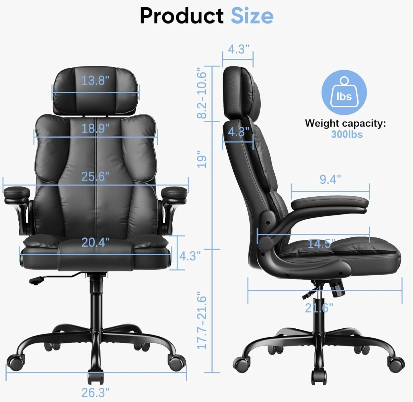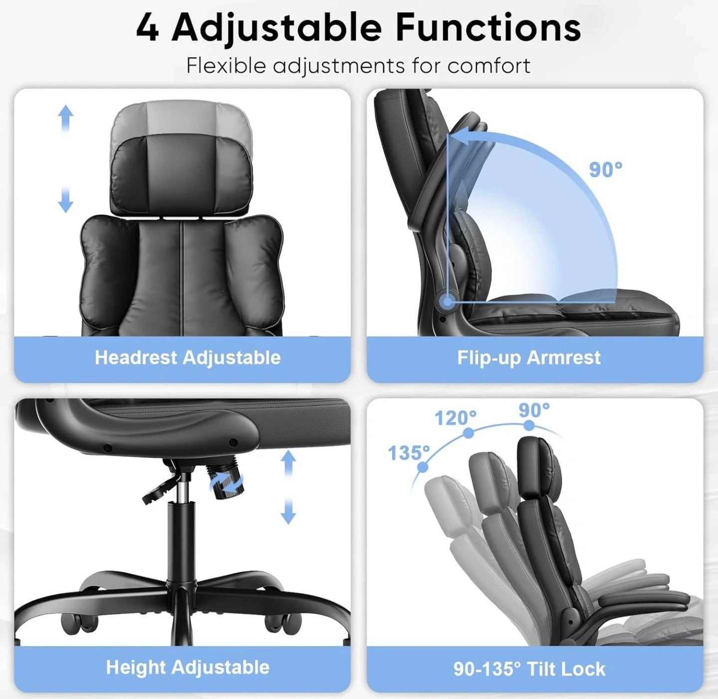 This black ergonomic office chair offers multiple adjustable functions for your comfort. It features a flip-up armrest, adjustable headrest, and adjustable height, plus a 90-135° tilt lock. The chair has S-shape lumbar support and a double padded design for extra comfort. Weight capacity is 300lbs.