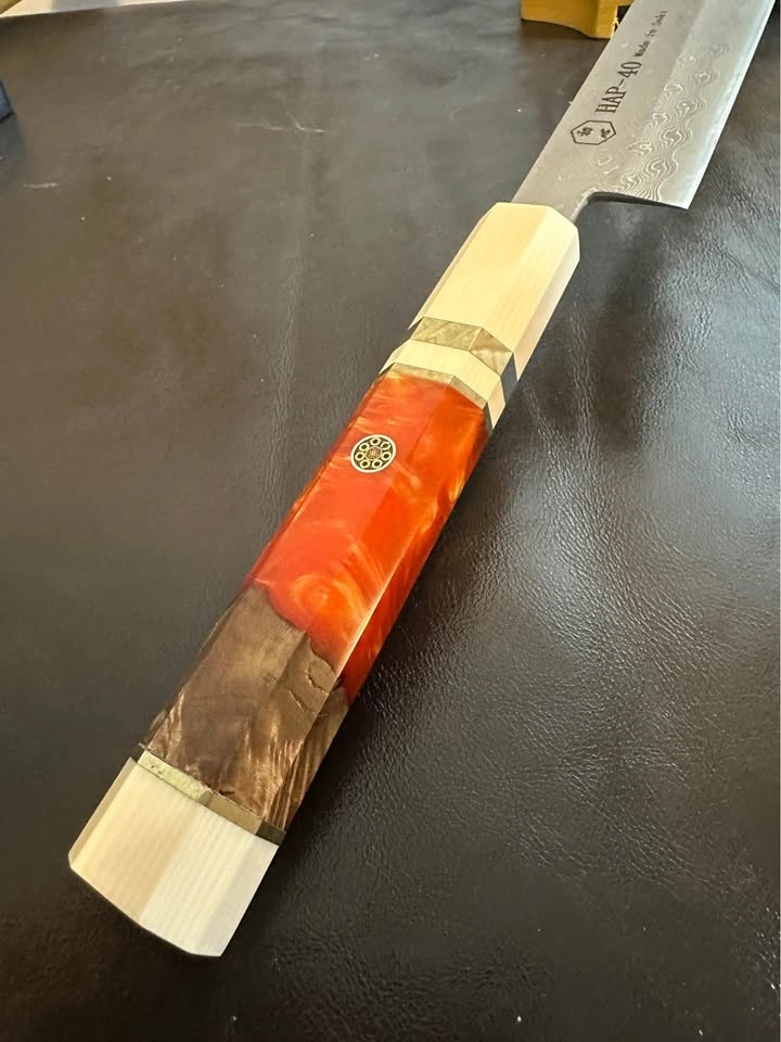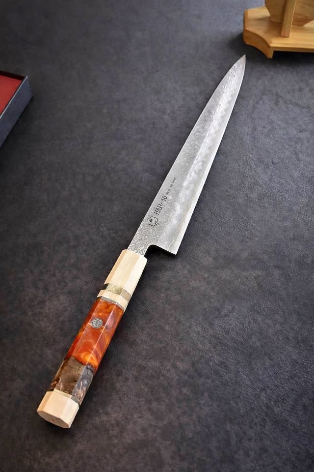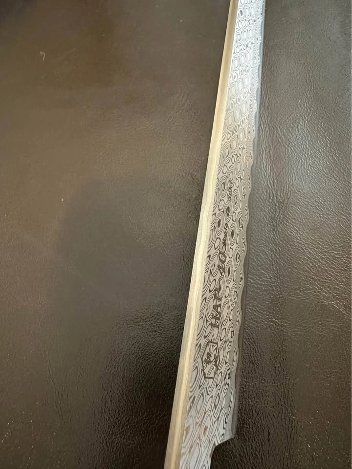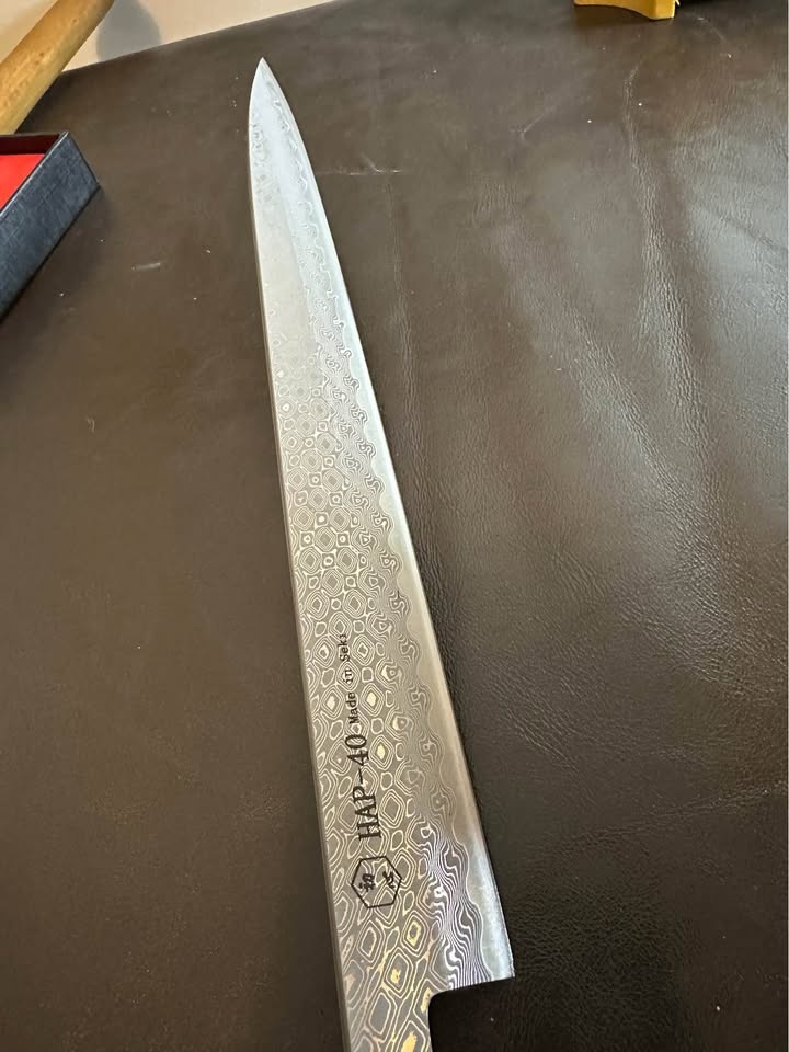 High-quality Japanese-style Damascus chef knife, 30cm. Perfect for home cooks and professionals. Features a Damascus steel blade with a HAP-40 high-carbon steel core for an extremely sharp edge. Pick up in Richmond.