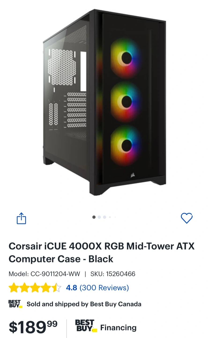 Selling a Corsair iCUE 4000X RGB Mid-Tower ATX Computer Case in black. It's in great condition and comes with Corsair fans. Originally bought for $189.99 from Best Buy Canada.